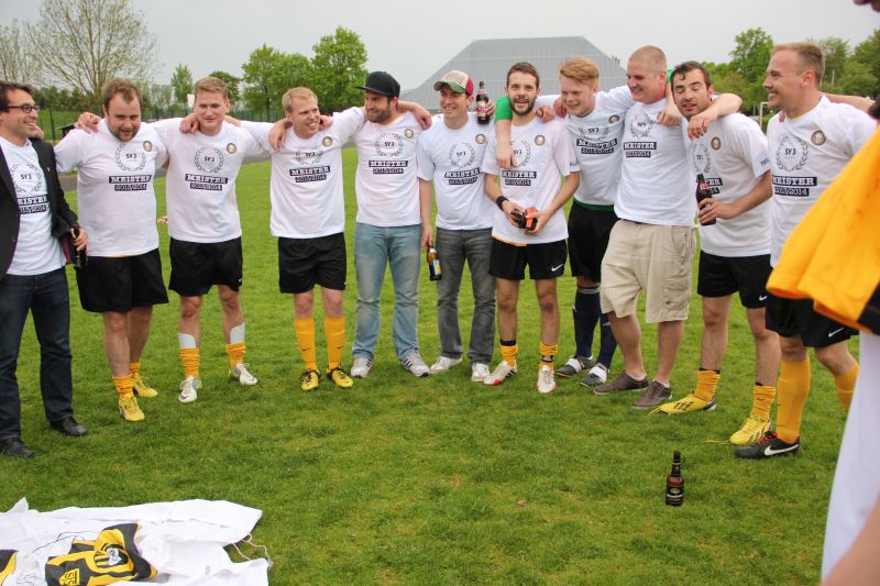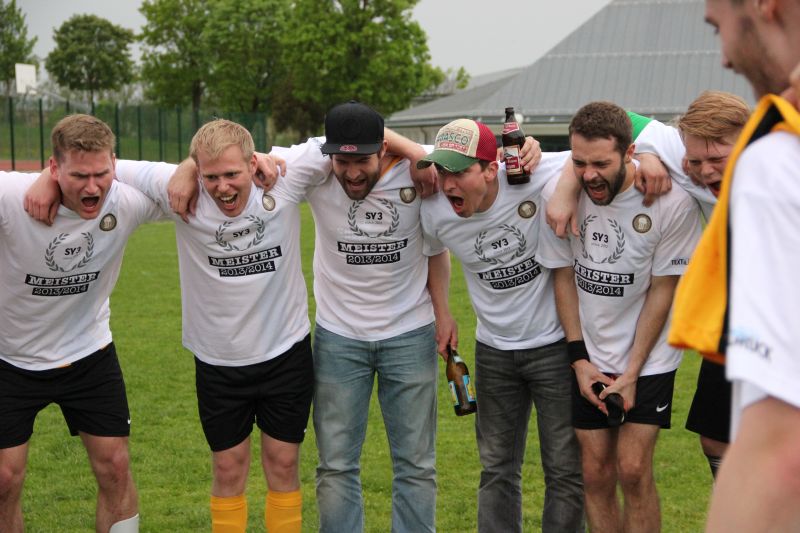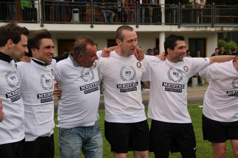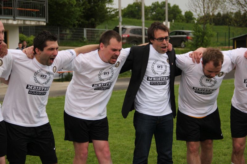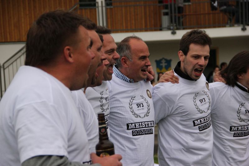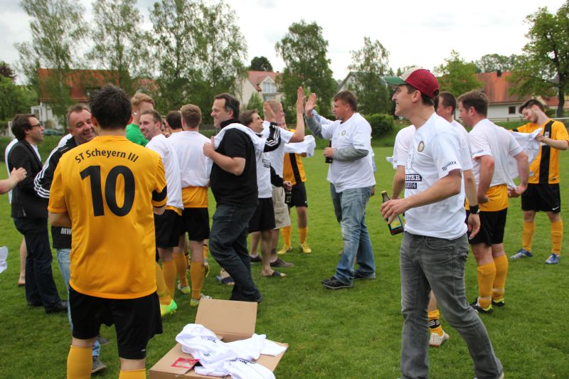 Manuel Türk (25., 42., 68.), Benjamin Ebertseder (80., 88.) und Simon Bomberg (44.) waren die Torschützen beim Sieg gegen die Geroldshausener 2. Mannschaft, aber das interessierte nach Spielende niemanden mehr. Die Meister-T-Shirts waren schon vorbereitet, viele Fans waren ins Ede-Stadion gekommen, um den Triumph mit der Mannschaft zu feiern. Beeindruckend ist der Siegeszug auch deswegen, weil die "SY3" (ST Scheyern 3) erst 2012 in den Spielbetrieb eingestiegen ist und damit gerade einmal die 2. Saison um Punkte kämpft. Bei 2 noch ausstehenden Spielen und mindestens 8 Punkten Vorsprung auf den Zweitplatzierten (der SC Pfaffenhofen hat noch 1 Spiel mehr als die Scheyrer zu bestreiten) kann niemand dem Team die Meisterschaft noch streitig machen.