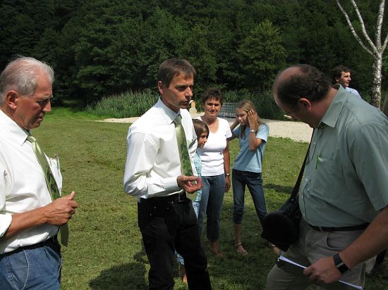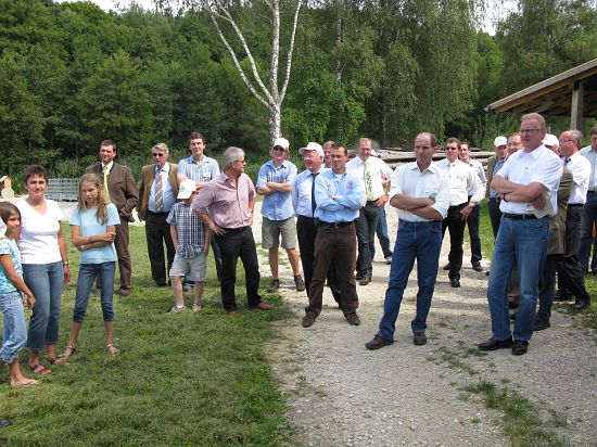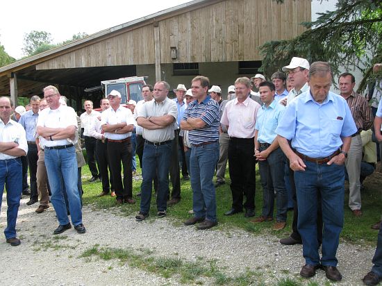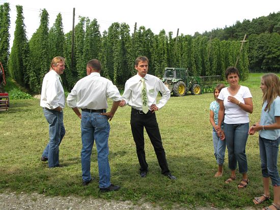 IGN-Mitglieder sind nicht auf Niederlauterbach beschränkt. IGN ist eine Hallertauer Qualitätsoffensive. So fuhr der Stangelmeier-Bus nicht ohne Stolz auf die weite Verbreitung mit den Gästen des Hopfentags nach der namentlichen Begrüßung duch IGN-Vorsitzenden Georg Breitner über Rottenegg, Untermettenbach, Unterpindhart und danach Richtung Gaden. Hier liegt inmitten der eigenen Hopfengärten der Kolmhof von Georg und Katharina Lutz. Georg ist der Bruder des Hüller Hopfenzüchters. Der Hof ist 60 ha groß, davon nimmt der Hopfenbau 20 ha ein. Hier wird professionell gearbeitet. Georg Lutz und seine Frau haben die Meisterprüfung und bewirtschaften alleine. Die Schweinehaltung ist ein 2. Standbein.