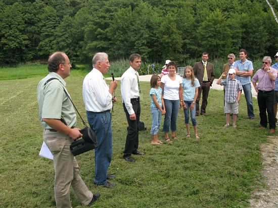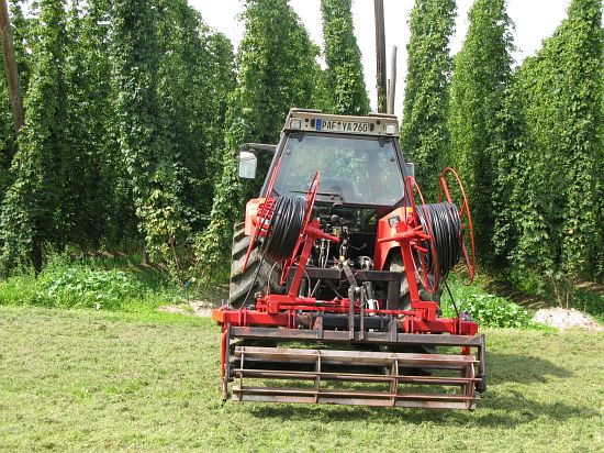 Die Hopfenbestände des Kolmhofs sind dieses Jahr ebenso mustergültig wie in der ganzen Hallertau. Ein Prachthopfen. Doch der Kolmhof wurde auch für die Besichtigung ausgewählt, weil Georg Lutz seine 20 ha mit künstlicher Bewässerung heuer ausgestattet hat. Lutz: „Die Bezuschussung durch die HVG hat diesen Voratz sehr beschleunigt.“. Ein Verlegegerät wurde von Lutz entwickelt, das aber auch von Schapfl, Grubwinn und Bogensberger, Barthhof im Anschluss eingesetzt wird. 5 ha (!) können damit pro Tag verlegt werden. Die Schläuche kommen in den Boden, weil sich dies über Jahre bei anderen bewährt hat.