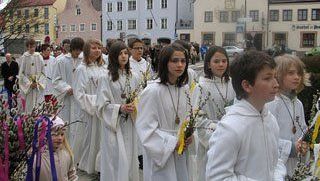 Trotz angesagten Regens: das Wetter passte für Gesang und die Prozession von der Mariensäule zur Pfarrkirche - mit Palmbuschen, vielen Ministranten, die Kommunionkinder,...