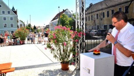 Fünf aneinandergereihte Wasser-Fontänen schmücken seit heute zusätzlich die neugestaltete Ortsmitte von Manching. Ein Baum wird noch hinzukommen, doch erst etwas...