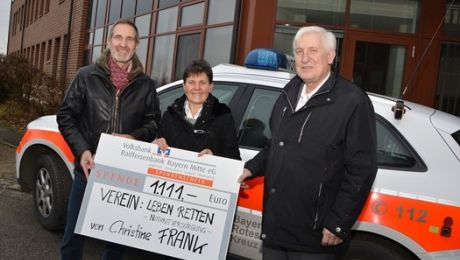 Einen symbolischen Spendenscheck mit einer Summe von exakt 1111 Euro überreichte Christine Frank am heutigen Nachmittag vor der Pfaffenhofener BRK-Rettungswache...