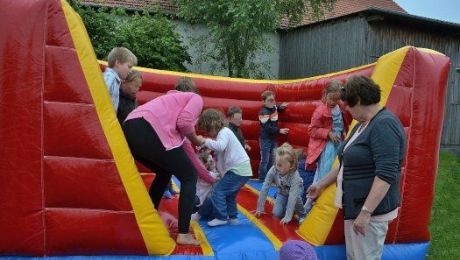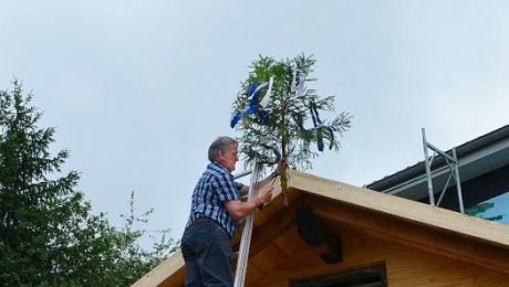 Ein klassisches Richtfest feierten am gestrigen Samstag die fast zwei Dutzend Helfer beim Bühnenbau für das im August stattfindende Freilichttheater „Holledauer...
