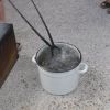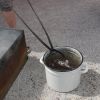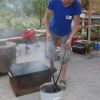 Bei gut 900 Grad öffnet Moddy Motzke den mobilen Gasbrandofen und entnimmt mit einer langen, eisernen Zange die glühend heißen Keramikteile. Ein Blechkasten, gefüllt mit Sägespänen, ist der nächste Ort in dem die Kunstwerke abkühlen können. Bei dieser Schocktherapie für das Material entstehen Risse, in die sich dann der Kohlenstoff des Holzes, der bei seiner Verbrennung entsteht, einbindet. Nach ungefähr 10 Minuten ist das Werkstück soweit abgekühlt, das es endgültig im Wasserbad abgelöscht werden kann.
