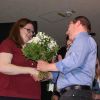 Die beiden Lehrerinnen Susanne Krug und Theresa Stoiber freuen sich über ein Blumengeschenk