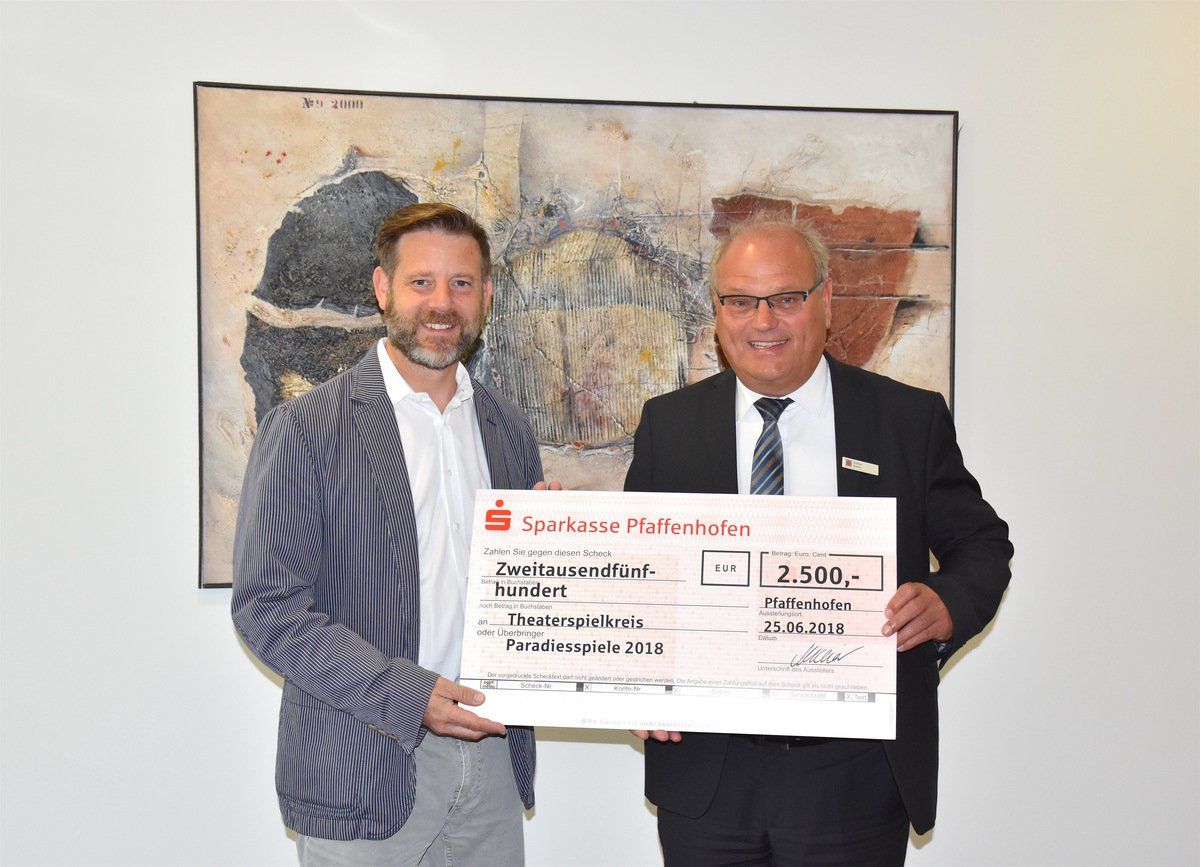 Der Theaterspielkreis konnte sich jetzt über eine Spende der Sparkasse in Höhe von 2500 Euro freuen. Den symbolischen Scheck überreiche Vorstand Stefan Maier an den 1. Vorsitzenden Steffen Wagner, der sich bei dieser Gelegenheit herzlich für die aktuelle „Gabe“ und gleichzeitig für die bereits langjährige Unterstützung durch die Sparkasse Pfaffenhofen bedankte. Und auf der Bühne am Oberen Hauptplatz hängt weithin sichtbar ein Banner der Sparkasse als Sponsor des Großevents.