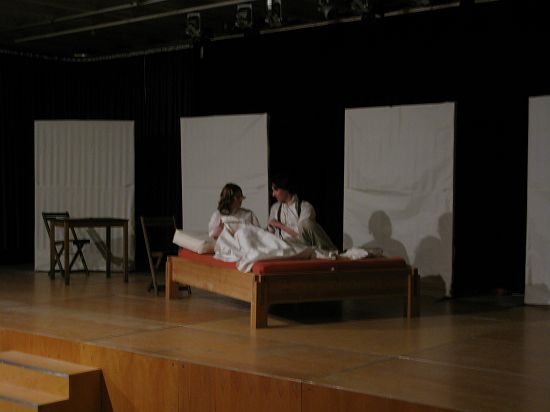 Die „Zehn Dialoge mit neun Unterbrechungen und einer Moral am Schluss“ fesselten die zahlreichen Zuschauer in der Aula von der ersten Sekunde an, als die Begegnung des Soldaten und der Dirne ohne Umschweife das Thema des Stücks offenlegte: Mit einem verächtlichen Blick auf die unterschiedlichsten Beziehungen zwischen Mann und Frau zeigte der „Reigen“, dass es immer nur um das „Eine“ geht, und wenn das erreicht war, hatte es einer der beiden Partner äußerst eilig, sich aus der Situation davonzustehlen. Die sexuelle Begierde als Motor kurzzeitiger Beziehungen ließ den Personen keinen Raum für gegenseitiges Verständnis oder gar eine tiefer gehende menschliche Beziehung. Und immer zeigten sich die Beziehungen auch als ein Spiel mit der Macht, die man über einen anderen Menschen ausüben kann.