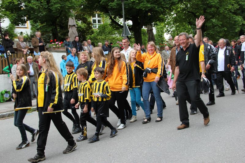 Befreundete Schützenvereine aus der gesamten Region, Feuerwehren und viele Vereine aus Scheyern und Umgebung nahmen teil. Das ergab ein farbenfrohes Bild, immer abwechselnd volkstümliche Tradition und vereinsbezogene Thematik. Von den Scheyrer Fußball-, Handball- und Ski-Teams über Kindergarten, Scheyrer Bühne, Wanderfreunden bis hin zu WGS oder Nachbarschaftshilfe: alle waren sie mit mehr oder weniger großer Besetzung dabei und beglückwünschten so den Schützenverein zu seinem 150jährigen Gründungsfest. Aber auch aus den Nachbarlandkreisen ließen es sich viele Vereine nicht nehmen und reisten mit großer Anhängerschaft an.