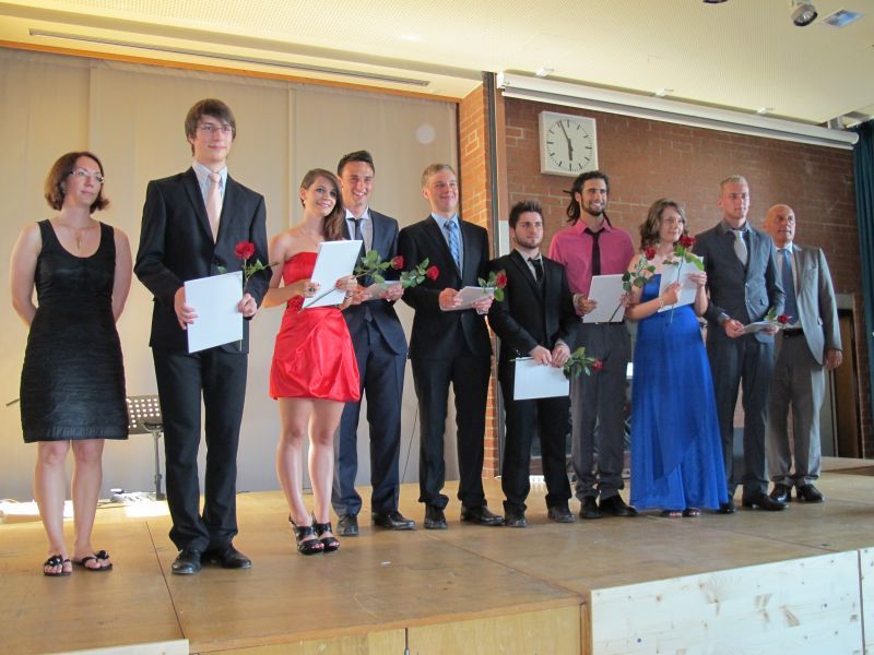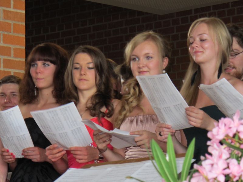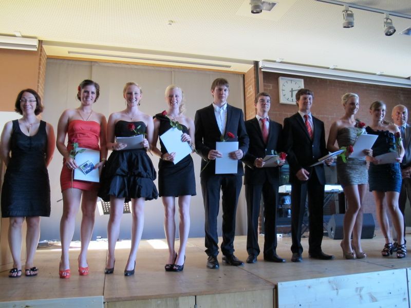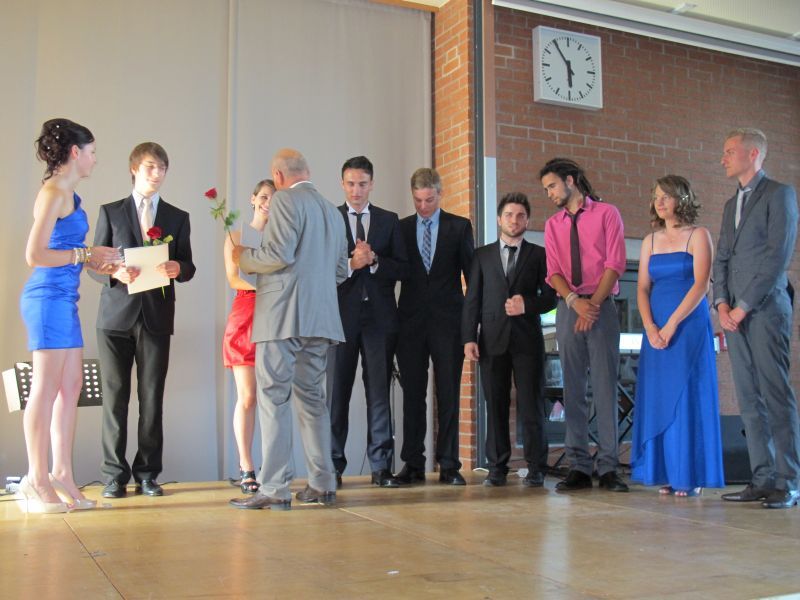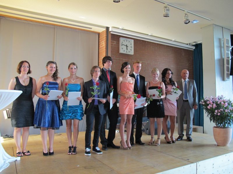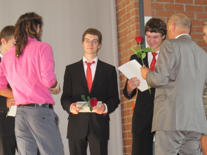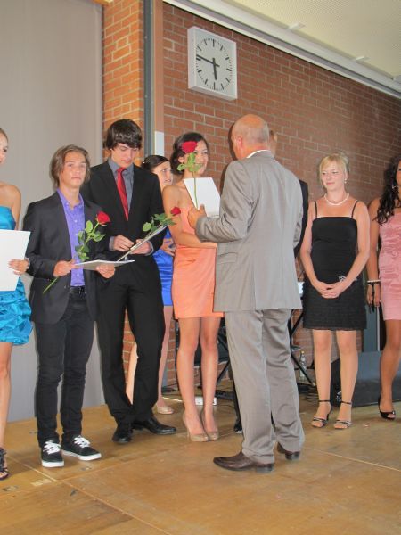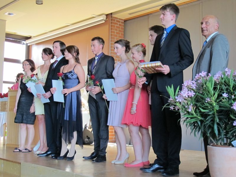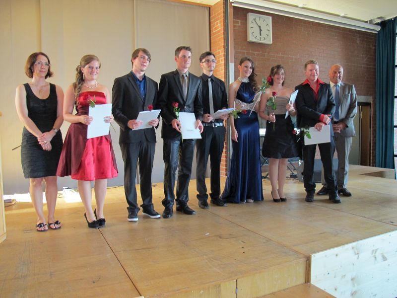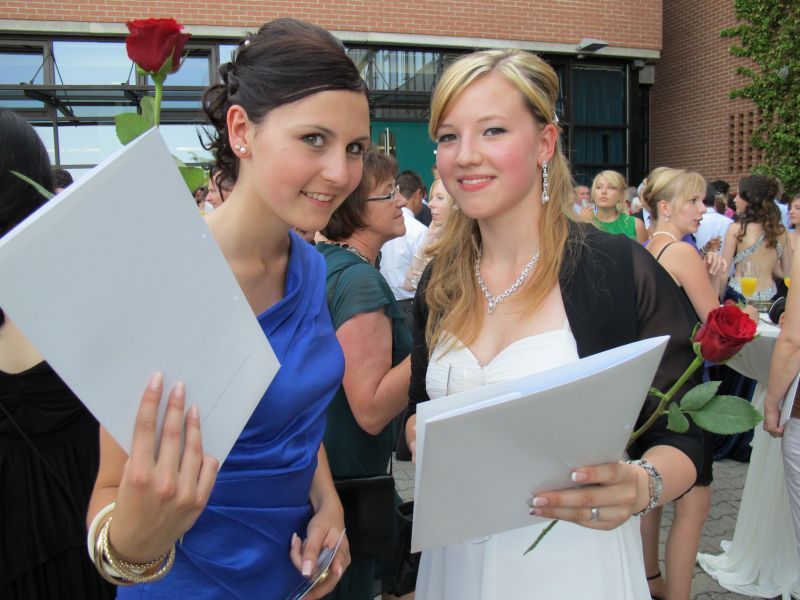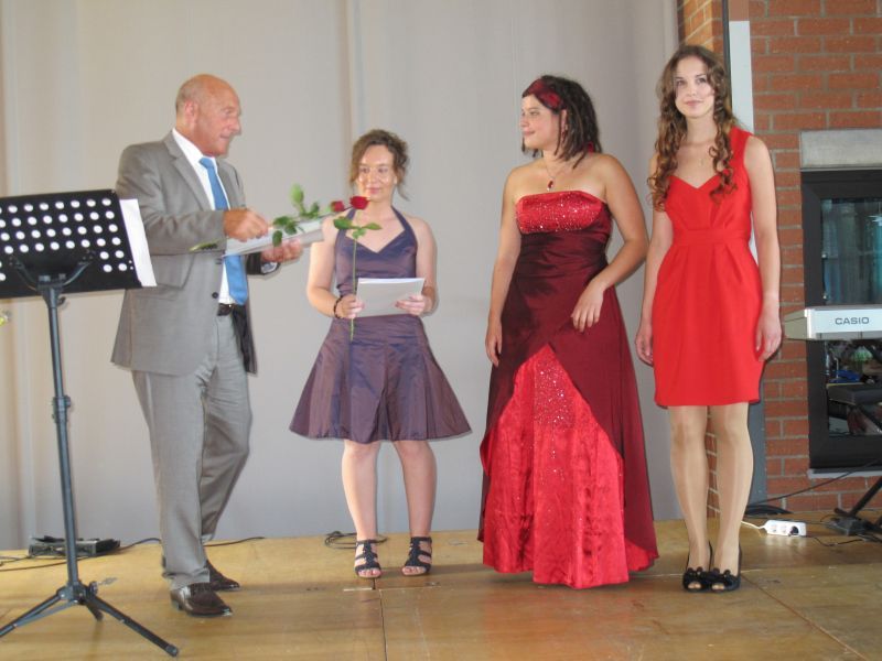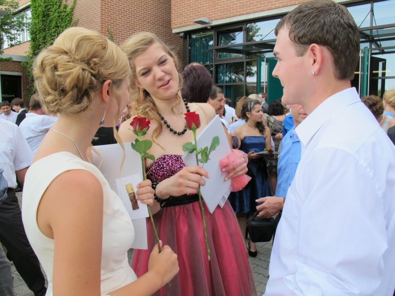Bei der feierlichen Übergabe der Zeugnisse schüttelte Herr Ludwig jedem einzelnem die Hand, gratulierte noch mal zum bestandenen Abitur und überreichte dazu eine rote Rose. Mit einem Duett von Vanessa Löb und Isabella Ruppert war der offizielle Teil beendet und vor den Toren der Schule wurde mit Sekt und Orangensaft auf diesen Erfolg angestoßen.