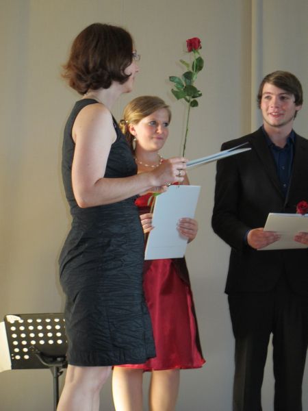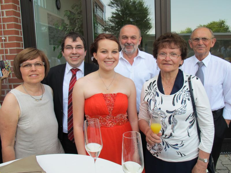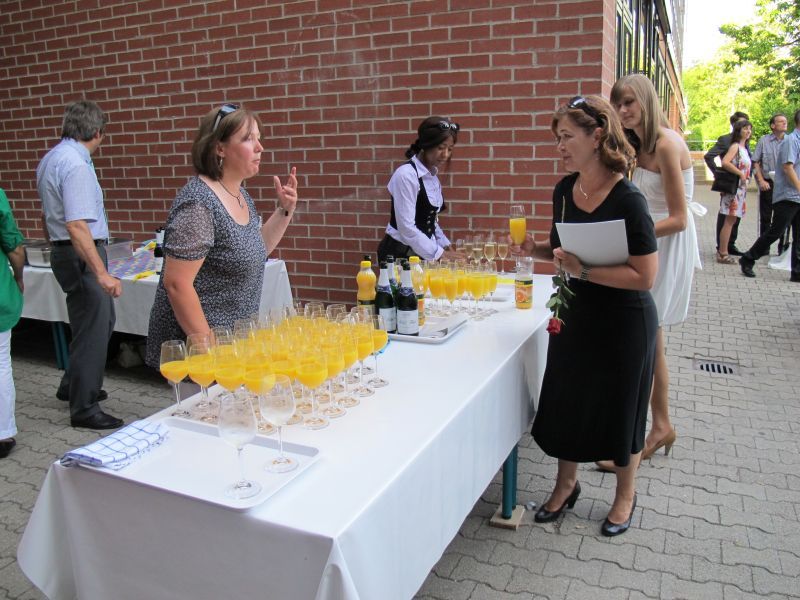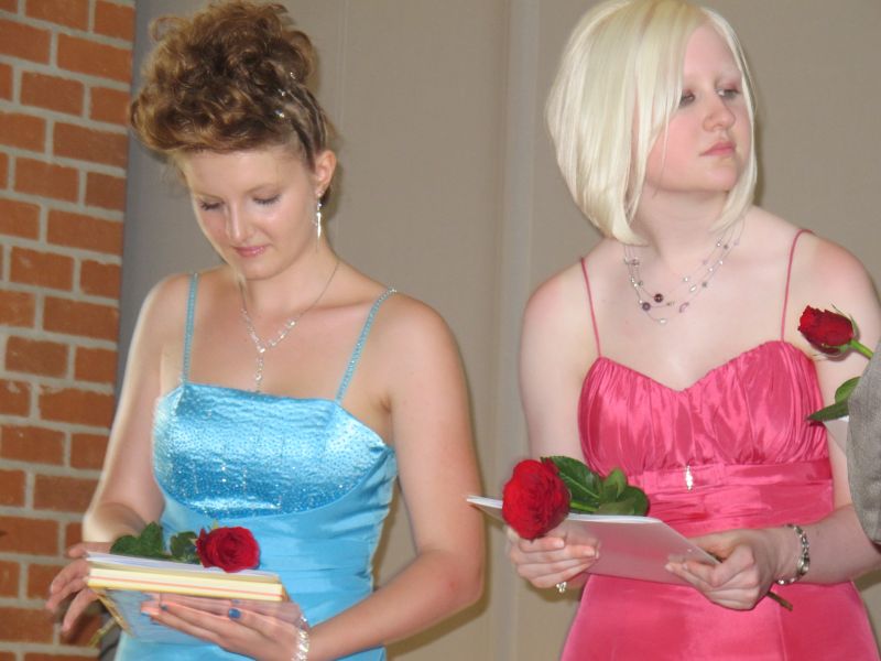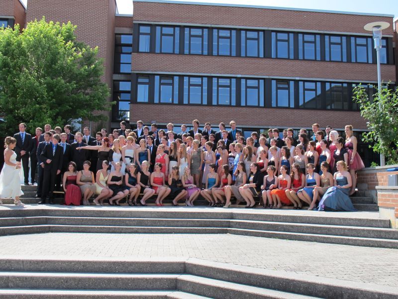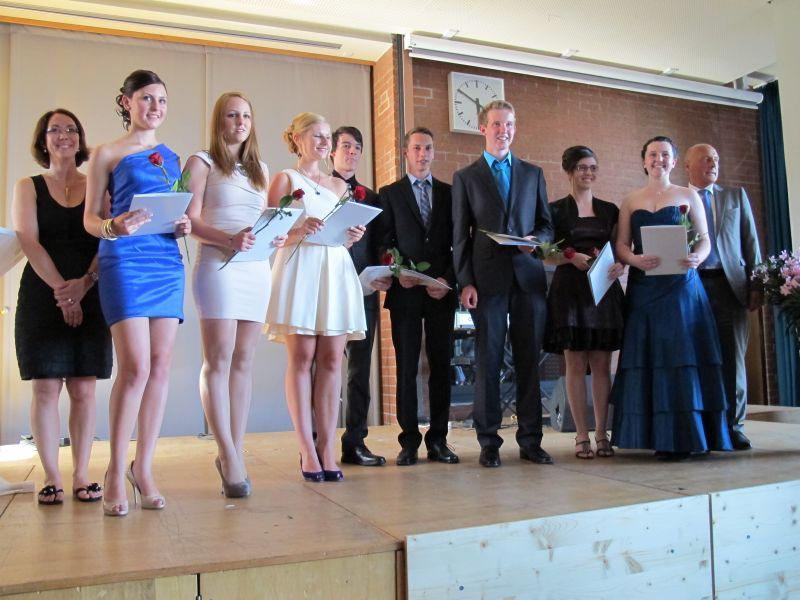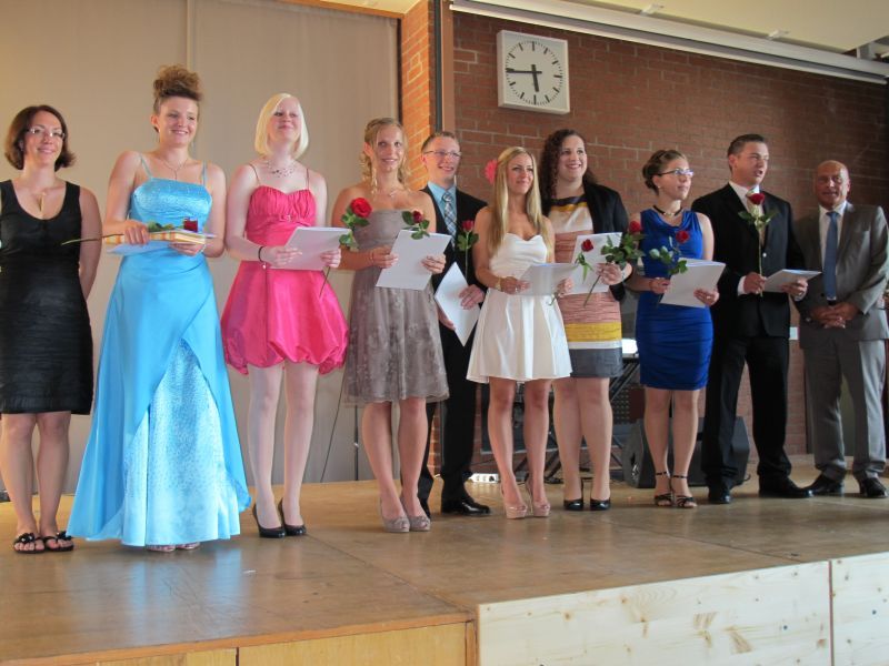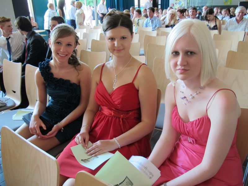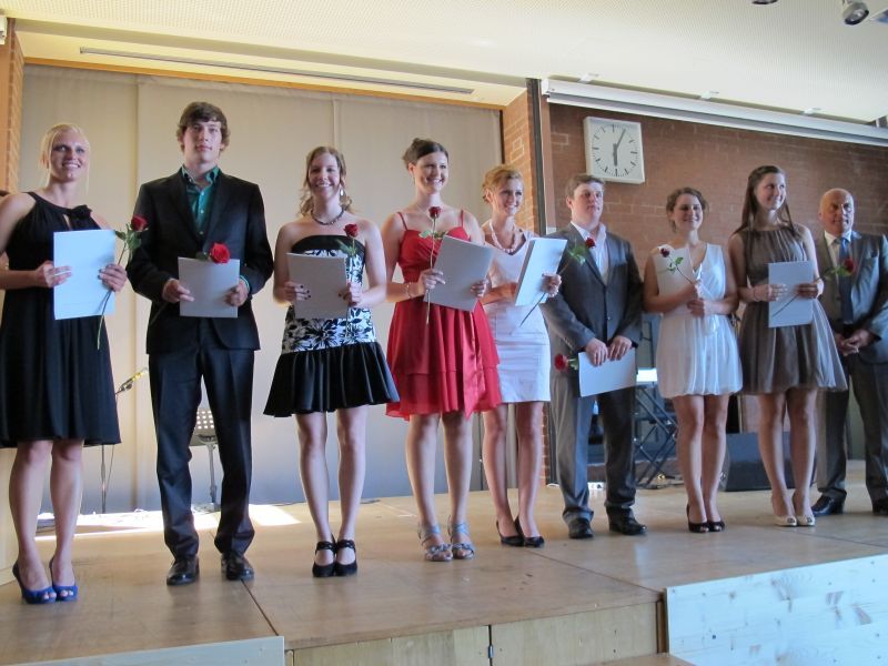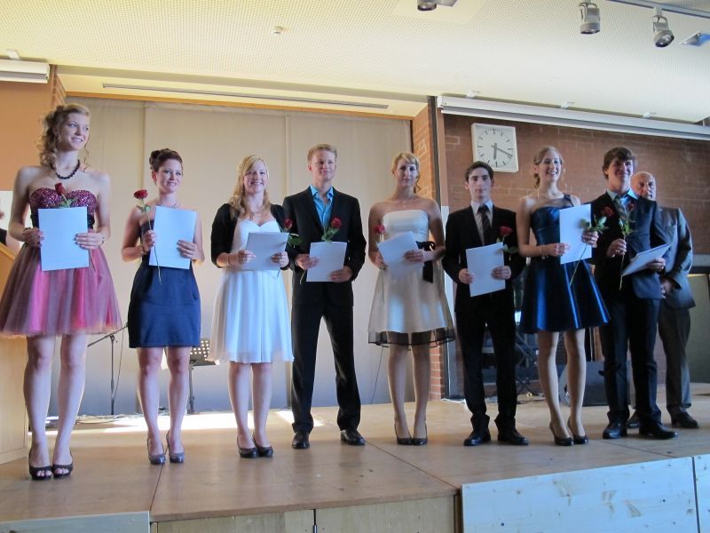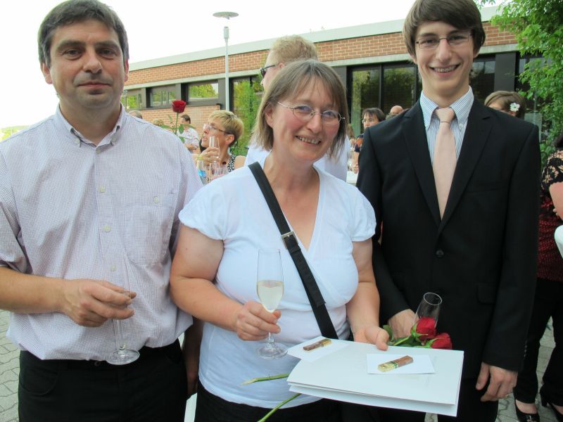 Bei der feierlichen Übergabe der Zeugnisse schüttelte Herr Ludwig jedem einzelnem die Hand, gratulierte noch mal zum bestandenen Abitur und überreichte dazu eine rote Rose. Mit einem Duett von Vanessa Löb und Isabella Ruppert war der offizielle Teil beendet und vor den Toren der Schule wurde mit Sekt und Orangensaft auf diesen Erfolg angestoßen.
