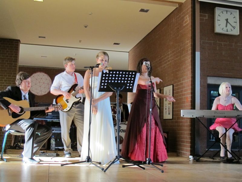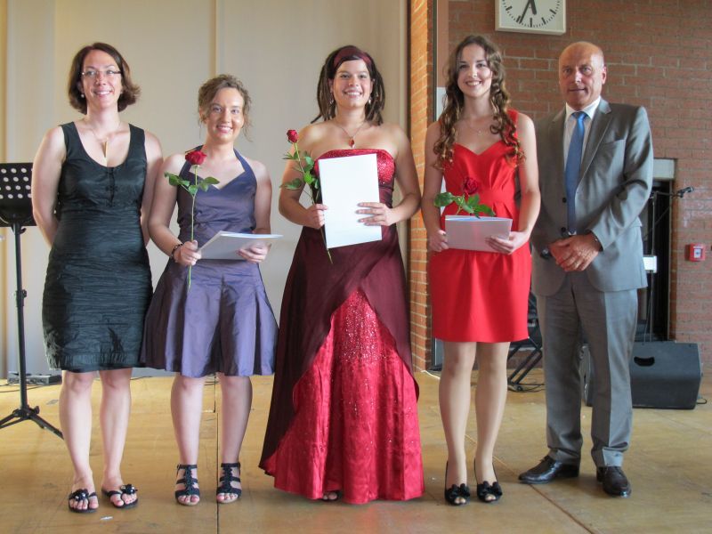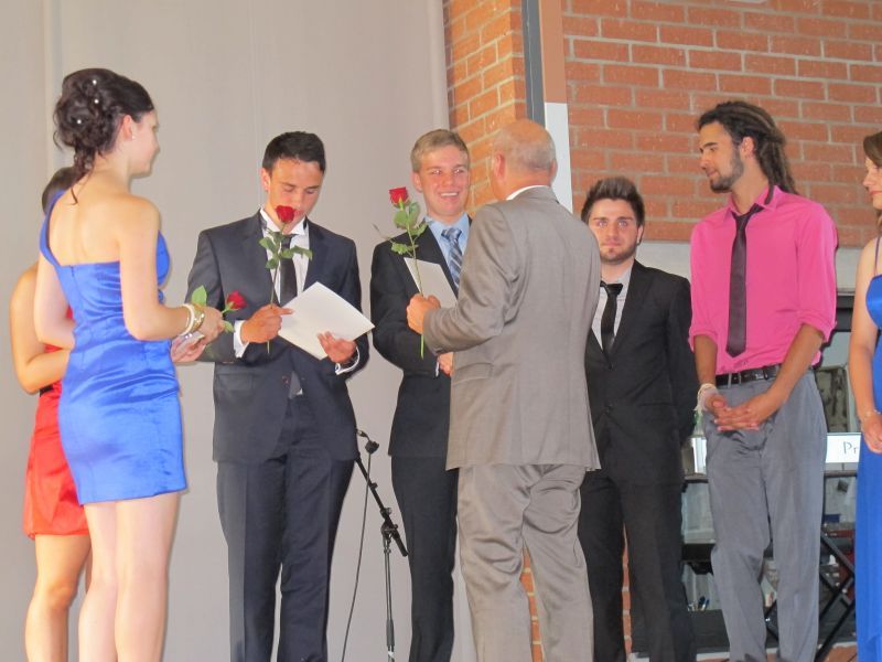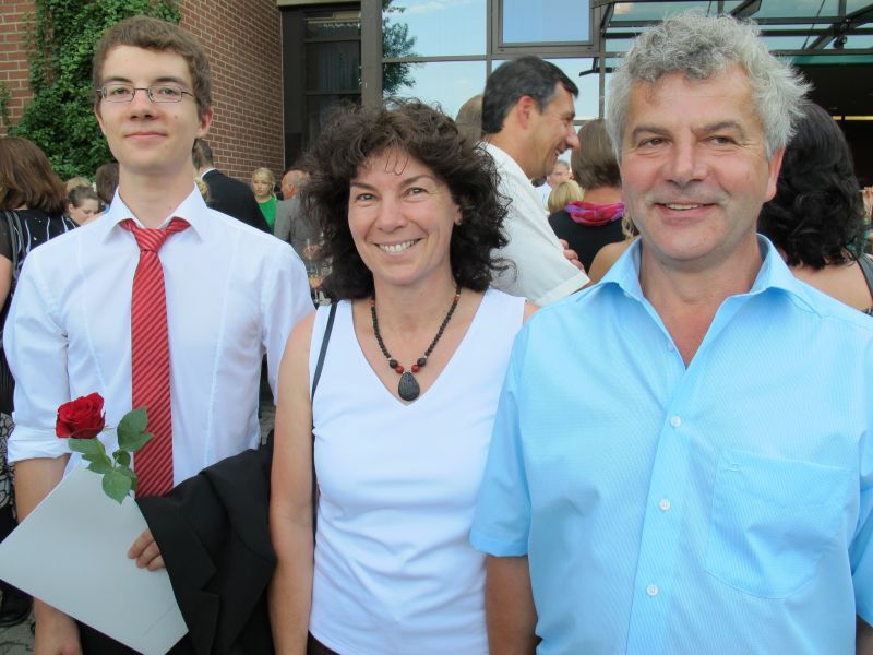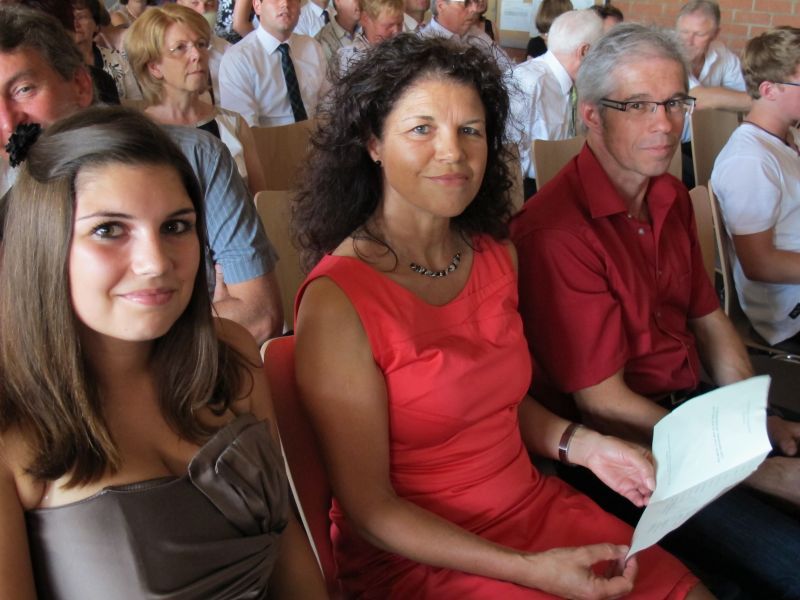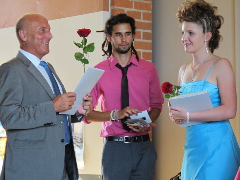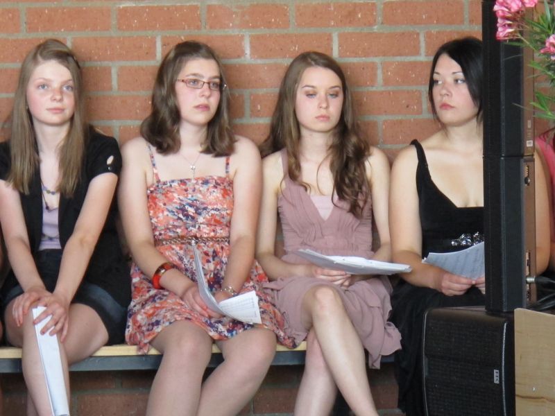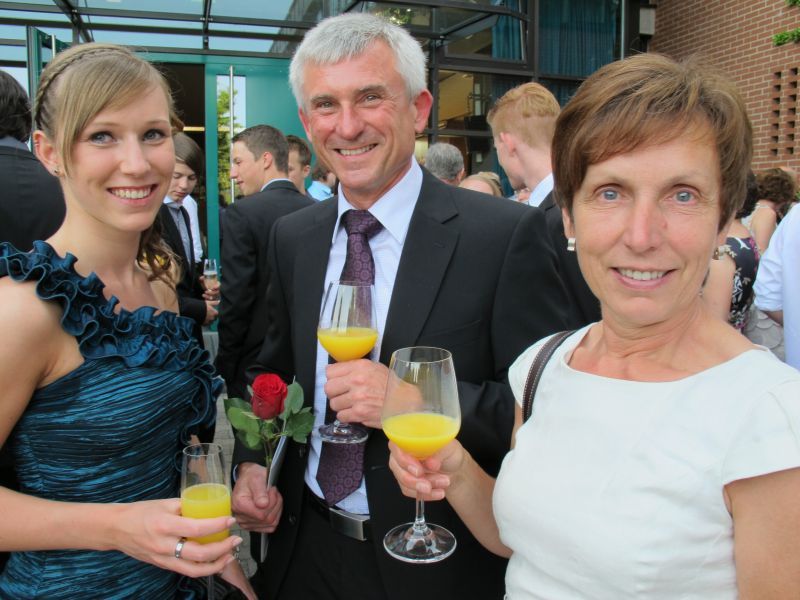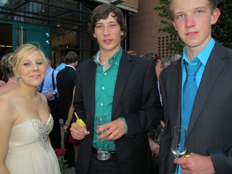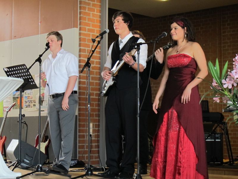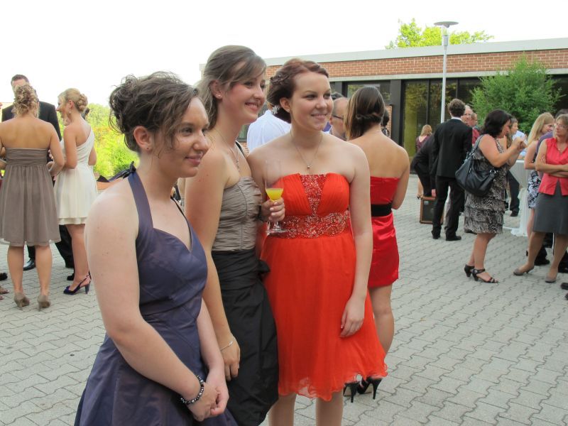 Bei der feierlichen Übergabe der Zeugnisse schüttelte Herr Ludwig jedem einzelnem die Hand, gratulierte noch mal zum bestandenen Abitur und überreichte dazu eine rote Rose. Mit einem Duett von Vanessa Löb und Isabella Ruppert war der offizielle Teil beendet und vor den Toren der Schule wurde mit Sekt und Orangensaft auf diesen Erfolg angestoßen.