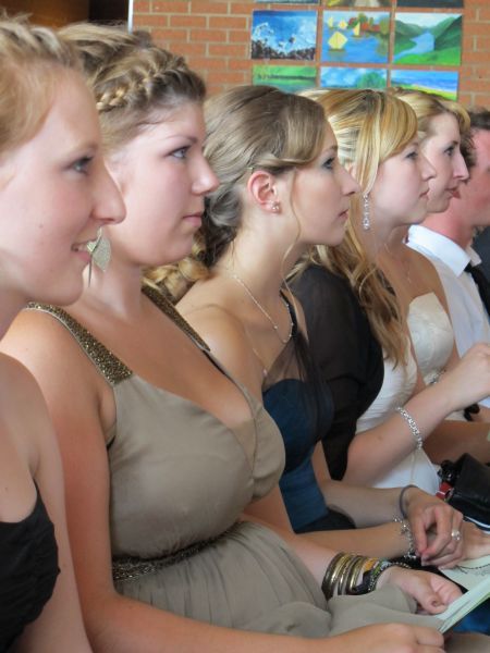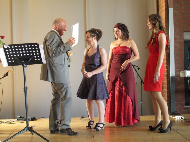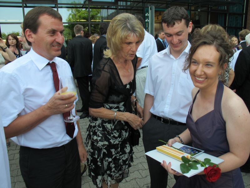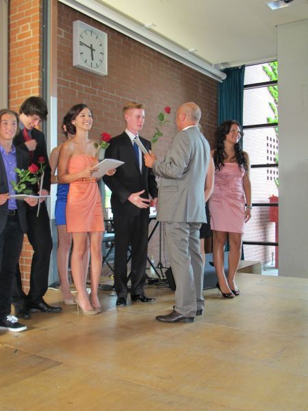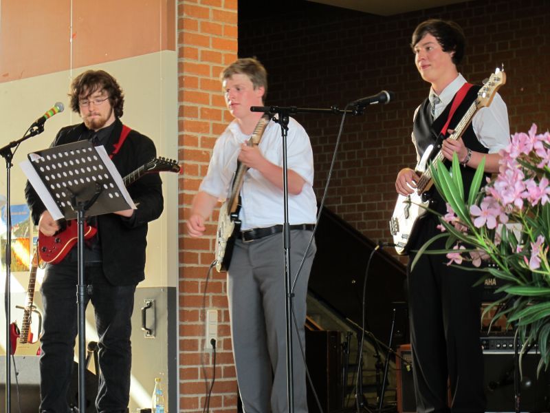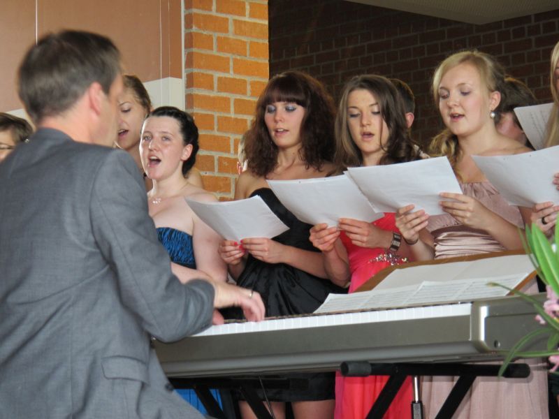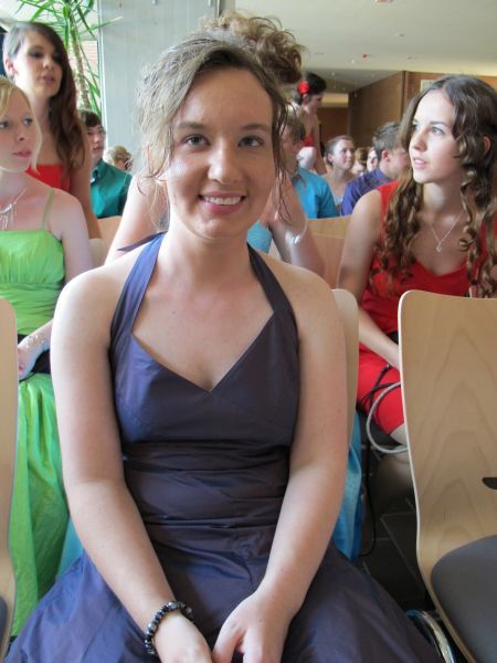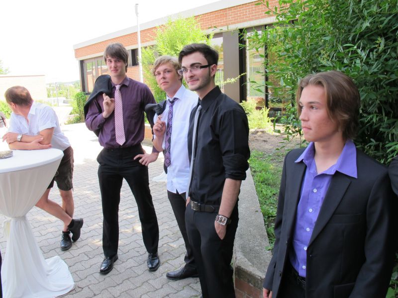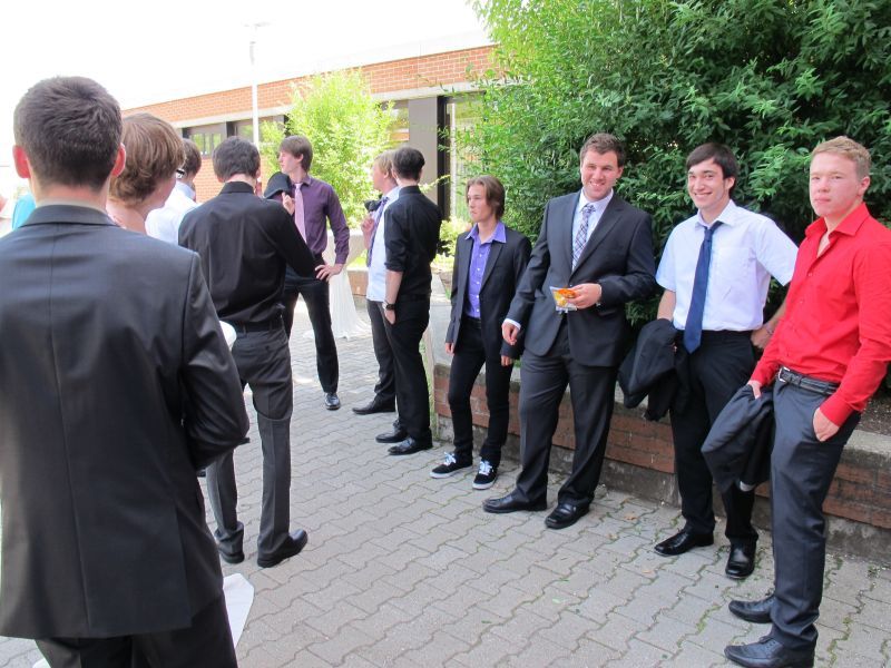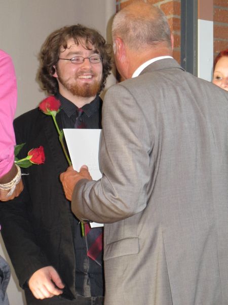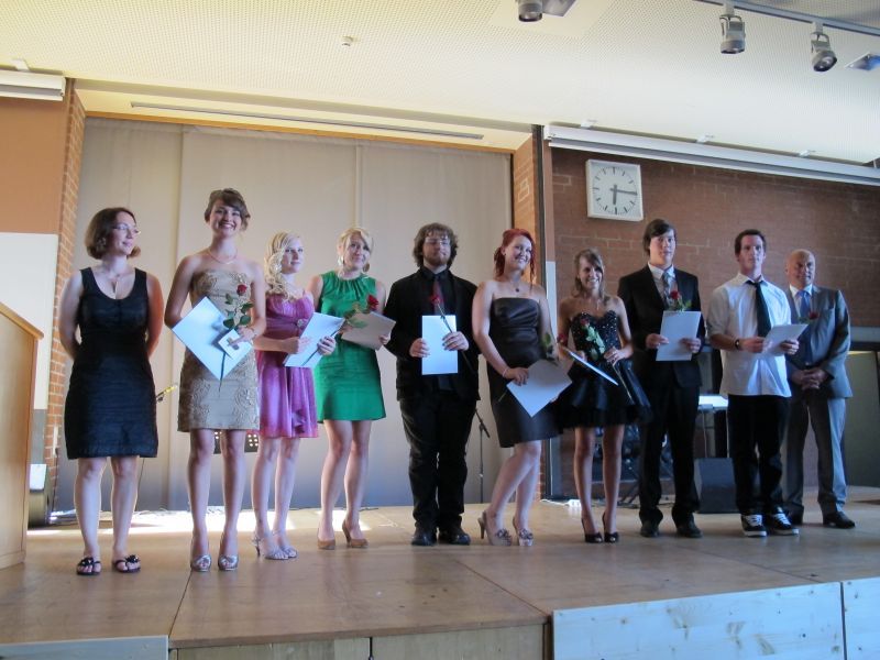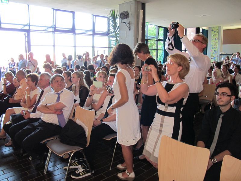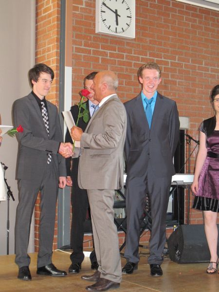 Bei der feierlichen Übergabe der Zeugnisse schüttelte Herr Ludwig jedem einzelnem die Hand, gratulierte noch mal zum bestandenen Abitur und überreichte dazu eine rote Rose. Mit einem Duett von Vanessa Löb und Isabella Ruppert war der offizielle Teil beendet und vor den Toren der Schule wurde mit Sekt und Orangensaft auf diesen Erfolg angestoßen.