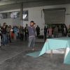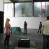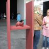 Für Wolfgang Kaiser, in gelbem (goldenen) Shirt unter schwarzem Hemd, sprechen seine Exponate – und ihre Installation. Die mit den Kaiserschen Kunstfiguren bevölkerte Kulturhalle ist zum faszinierenden Schauplatz absurder Ereignisse geworden, den der Besucher durchwandeln darf. Ein Paar Schuhe, schwarz eingefärbt und in den Raum gestellt, verlocken den Besucher zum Berühren; ebenso zieht ein zerknittertes Etwas, zwar golden glänzend, dennoch das Auge irgendwie an den verbeulten Kotflügel eines alten VW-Käfers erinnernd, die Fingerspitzen des Betrachters an, magisch eben, als würde die Optik die Haptik zu Hilfe rufen – zwei winzige rotbraune Sonnenschirme auf einem aus der weißen Wand wachsenden Mini-Balken sind leider für die tastende Hand zu weit entfernt …