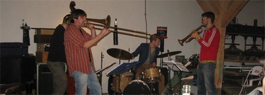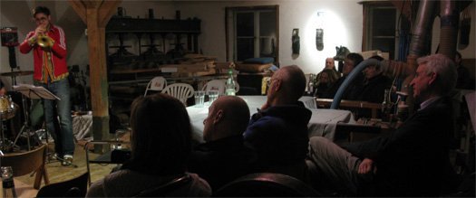 "Ich hatte gedacht, es kommen so vielleicht 15 Leute. Jetzt ist der Laden besucht wie an einem Wochenendtag." War auch Wacky Singer überrascht vom Zuspruch. So um die 50 Jazzer mögen es letztendlich wohl gewesen sein, die gespannt waren auf die Großstadt-Musiker. Und Matthias Schriefl (Trompete), Gerhard Gschlössl (Posaune), Robert Landfermann (Kontrabass) und Christian Lillinger (Schlagzeug) - alle zusammen "Schmittmenge Meier" - haben ihr Publikum mit Sicherheit nicht enttäuscht.