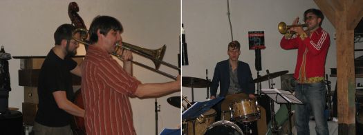Wozu natürlich auch die Musik beitrug: abwechslungsreich, jeder Solist virtuos auf seinem Instrument und abgestimmt im Zusammenspiel. Man merkte, die Jungs haben Erfahrung, haben sie doch - bevor sie sich zu diesem Ensemble formierten - mit Jazz-Größen wie Albert Mangelsdorff, Joachim Kühn, Nils Landgren oder Sam Rivers zusammen gespielt. "Blues Per Gerardo Gastello" mit dem Wechselspiel zwischen Posaune und Trompete etwa oder die wunderschöne Ballade "Ende" faszinierten die Zuhörer jedes auf seine Weise. "Hört gut zu: es kann bei jedem Stück sein, dass wir es hier und heute zum letzten Mal spielen." wurde das Publikum immer wieder animiert, sich zu auf die Musik zu konzentrieren.