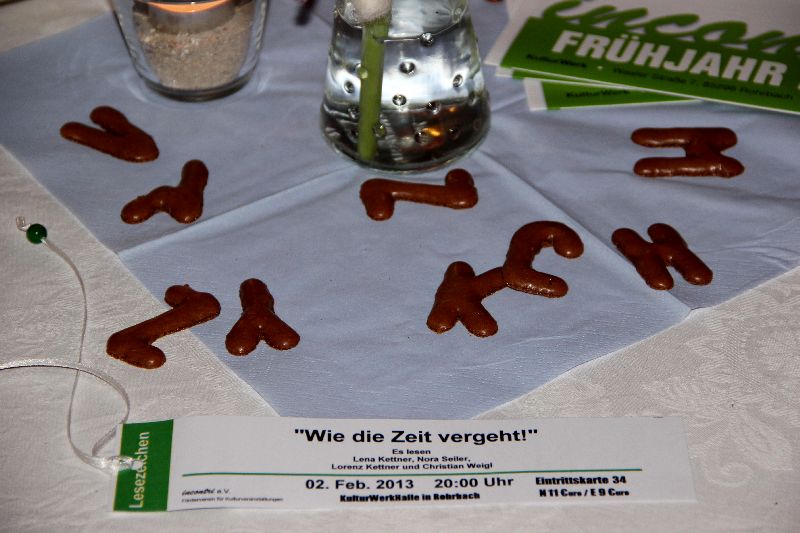 Die Gruppe 'Lesezeichen', das sind Lena Kettner, Nora Seiler, Lorenz Kettner und Christian Weigl. Seit mehr als 10 Jahren nehmen sie sich jeweils eines Themas an und durchstreifen die Literatur und das Zeitgeschehen unter diesem Aspekt. Mal nachdenklich, dann wieder kritisch, auch manches Mal tiefgründig und ganz häufig äußerst humorvoll: so setzt sich das Repertoire der Lesung zusammen. "Wie die Zeit vergeht" war das diesjährige Motto und wenn man sich die Autoren der vorgetragenen Textpassagen betrachtet, dann ist die Lesung an sich schon eine Reise durch die Zeit. Von Hölderlin über Fontane zu Michael Ende unter Einbeziehung von Zitaten und Aphorismen zeitgemäßer oder historischer, bekannter oder unbekannter Personen - alles und jedermann setzte sich mit dem Thema Zeit unter seinem jeweiligen ganz persönlichen Gesichtspunkt auseinander.