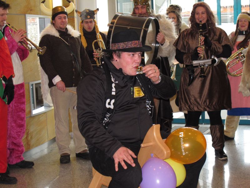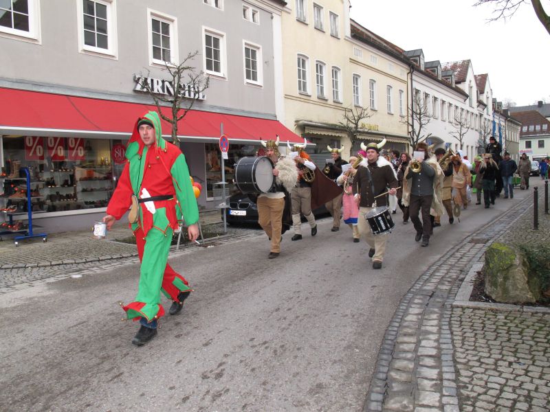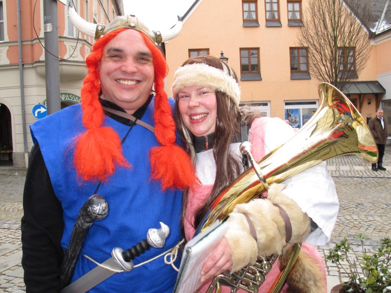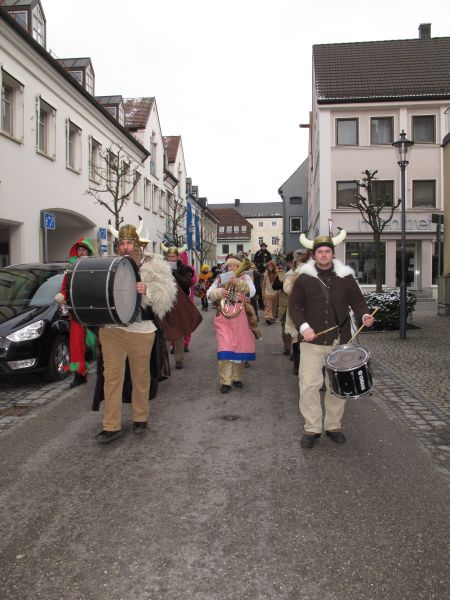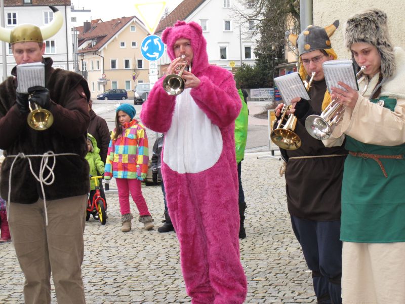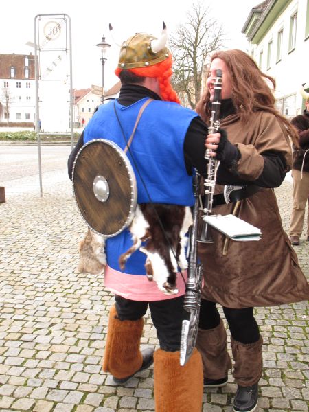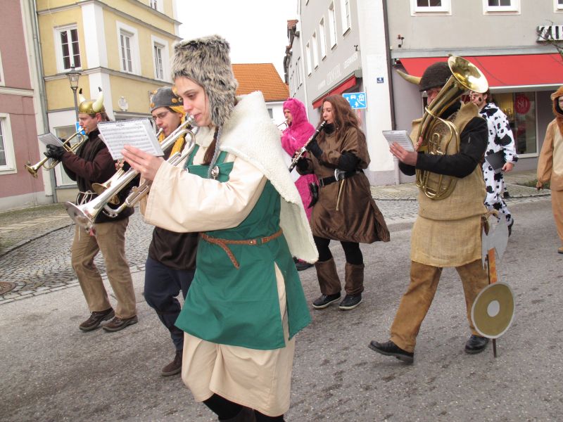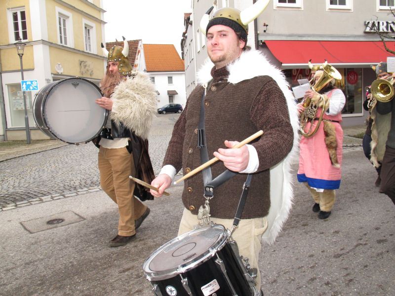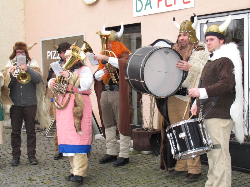 Die Kapelle, die den närrischen Zug anführte, hatte sich in wilde Wikingerkostüme geworfen, und spielte trotz der Kälte und ohne Pause zünftige Faschingslieder.
