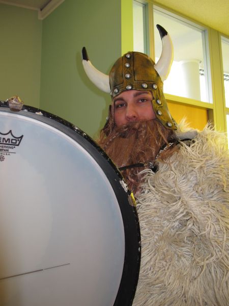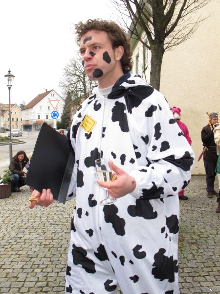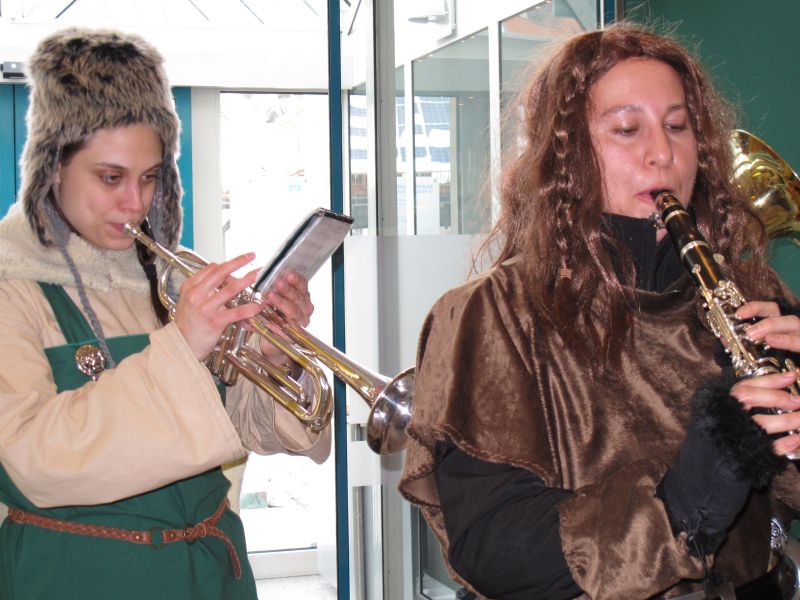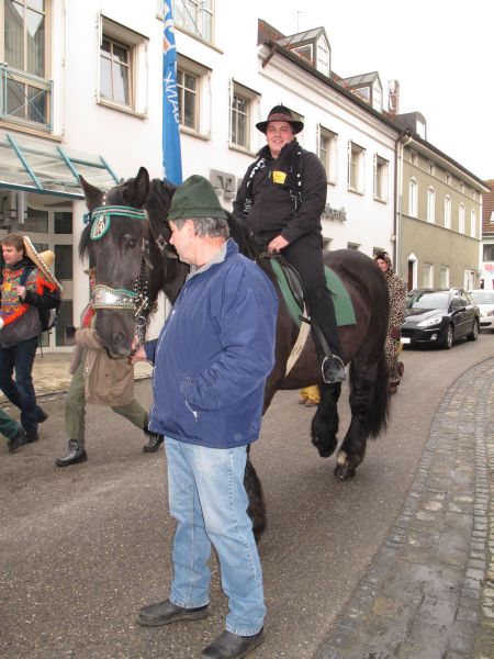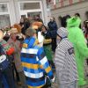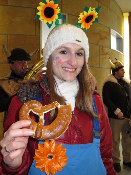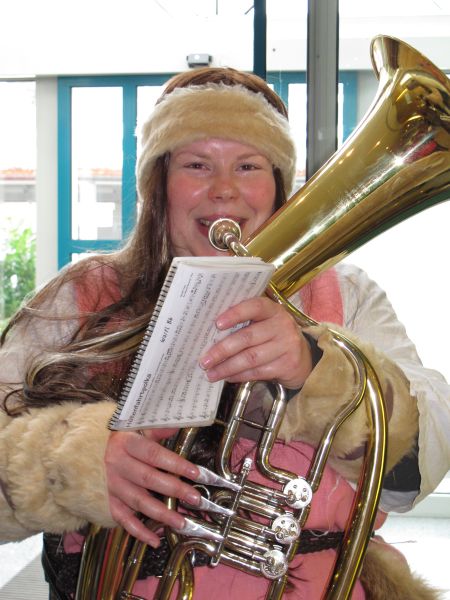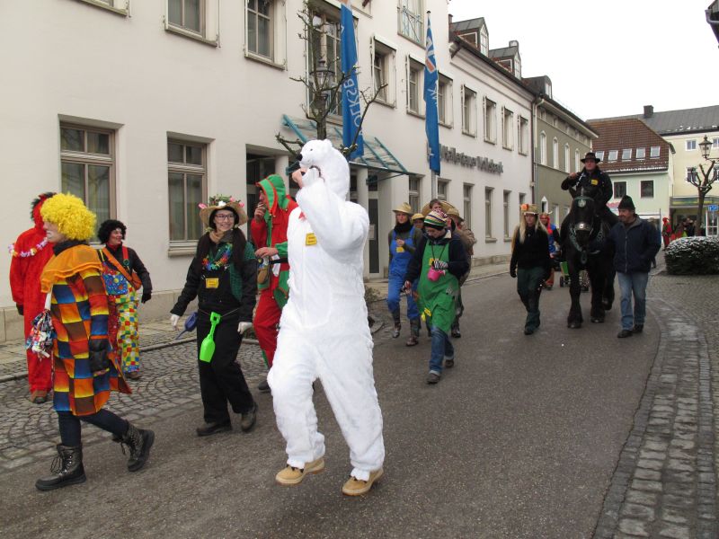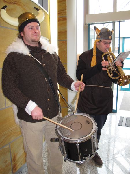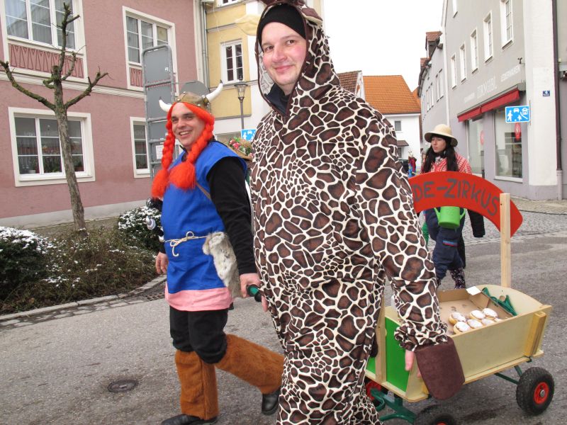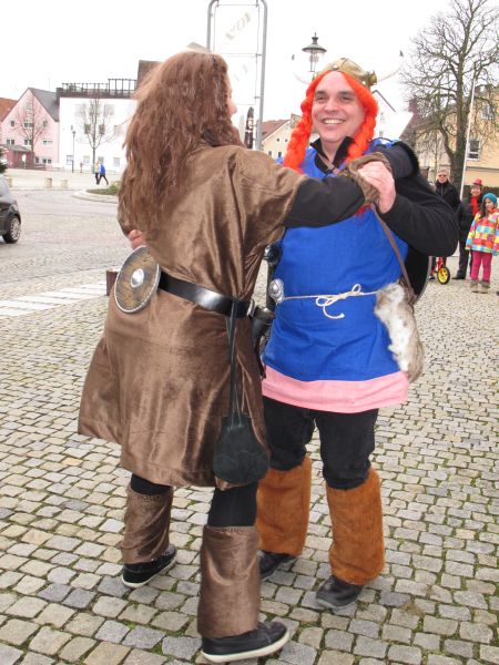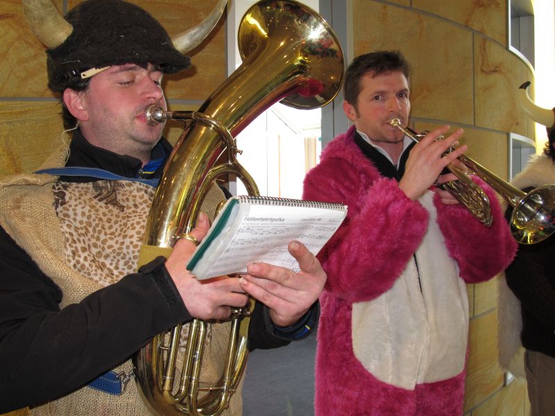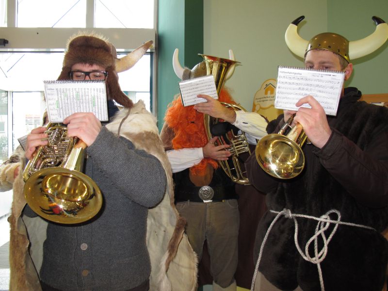 Die Kapelle, die den närrischen Zug anführte, hatte sich in wilde Wikingerkostüme geworfen, und spielte trotz der Kälte und ohne Pause zünftige Faschingslieder.