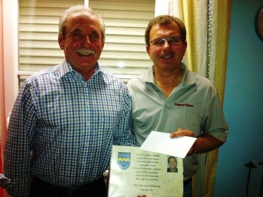 In den 15 Jahren leitete Günter Reisner als Unparteiischer die sagenhafte Zahl von 1.500 Spielen, und in den 11 Jahren als Einteiler zeichnete er für die Besetzung von rund 15.000 Spielleitungen durch seine Kameraden verantwortlich. Gruppen-Schiedsrichterobmann Albert Schnell (links) gratulierte seinem Vize im Namen aller Unparteiischen und wünschte Gesundheit und noch viele Jahre Freude an der Schiedsrichterei.