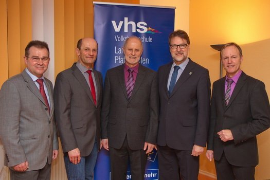 Karl Huber (Geschäftsführer der vhs), Gerhard und Fritz Hammer (Vermieter), Landrat Martin Wolf, Peter Sauer (Leiter der vhs, v.l.n.r.).