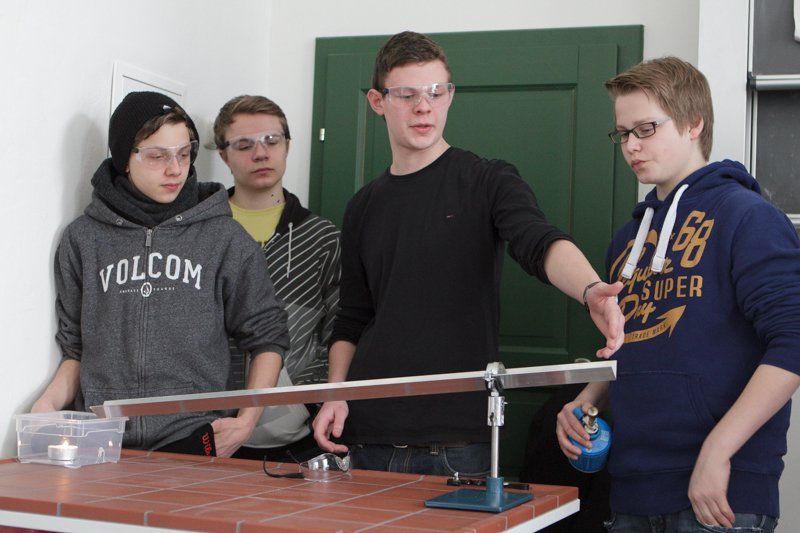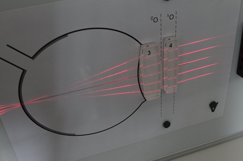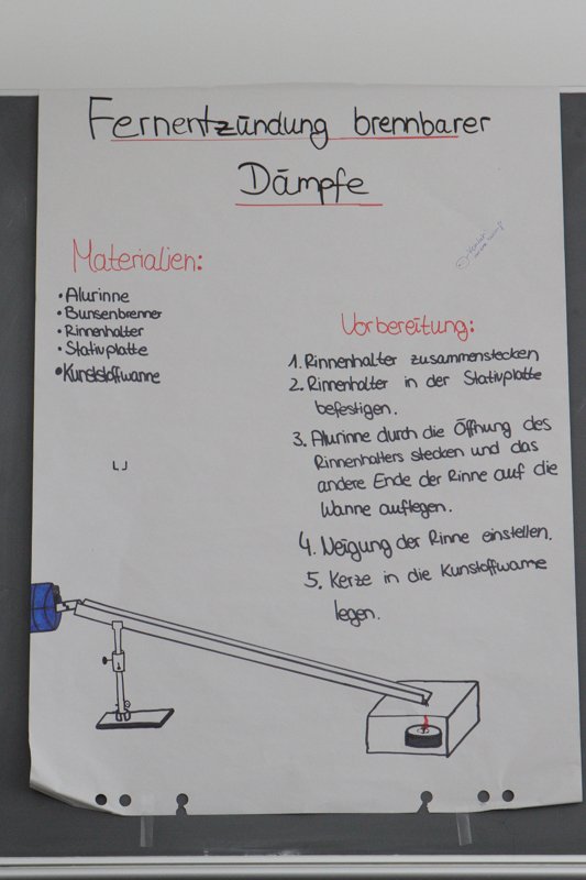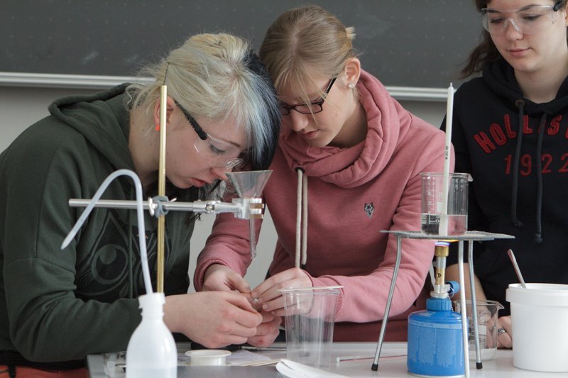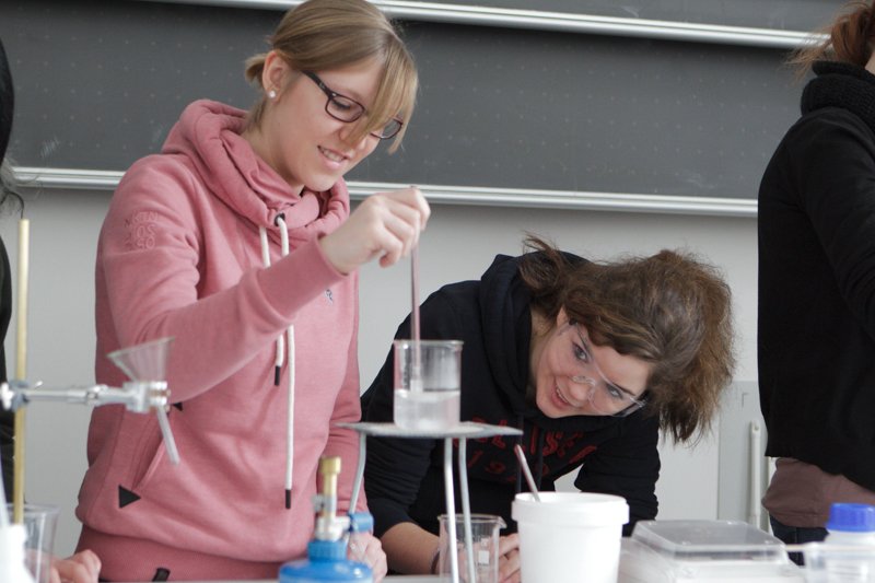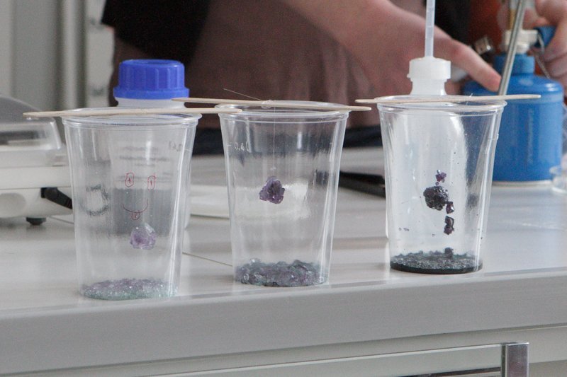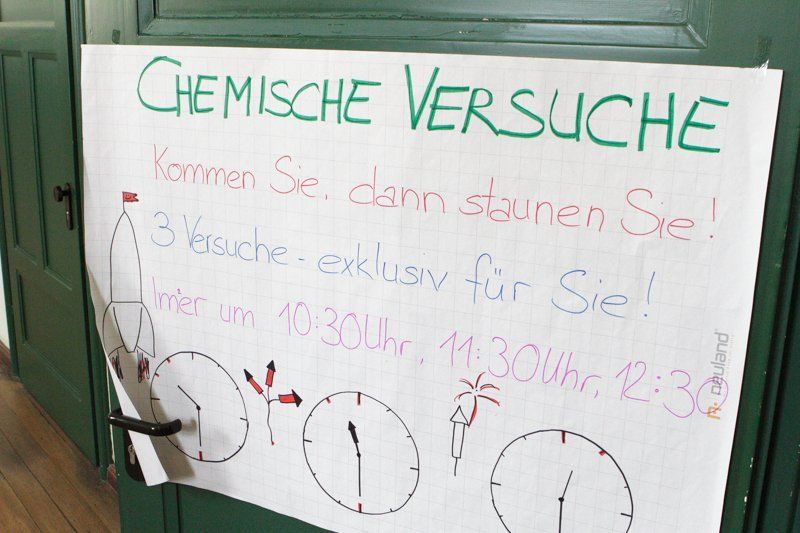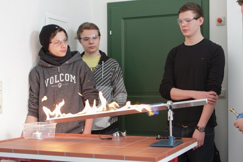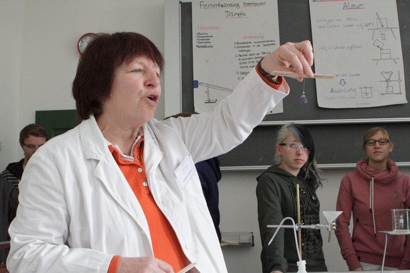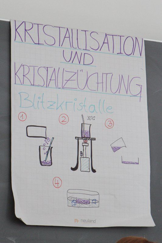 Um halb elf waren die experimentierfreudigen Wissenschaftler der FOS am Start. Im Chemiesaal wurden von Schülern 3 unterschiedliche Versuche durchgeführt. Demonstriert wurde die Fernzündung brennbarer Dämpfe mithilfe einer Alurinne und einem Teelicht, die Zucht eines Einkristalls aus Alaun – welche allerdings mehrere Tage in Anspruch nimmt – und die Züchtung von Blitzkristallen. Gleich nebenan im Physiksaal standen Interessierten zahlreiche interaktive Versuche zum ausprobieren zur Verfügung. So konnte man beispielsweise die Lichtbrechung und Fehlsichtigkeit am Auge darstellen und mittels geeigneter Linsen korrigieren.