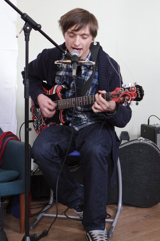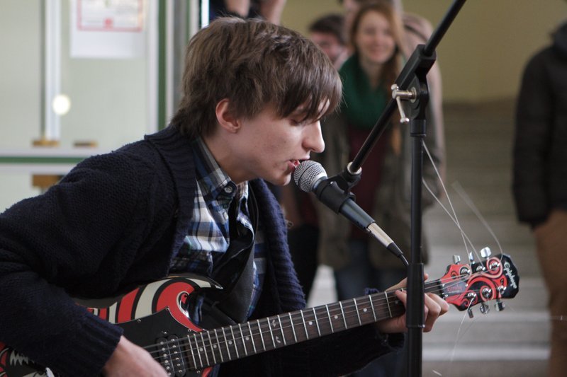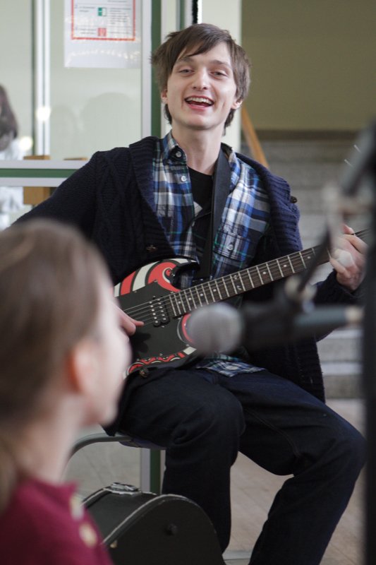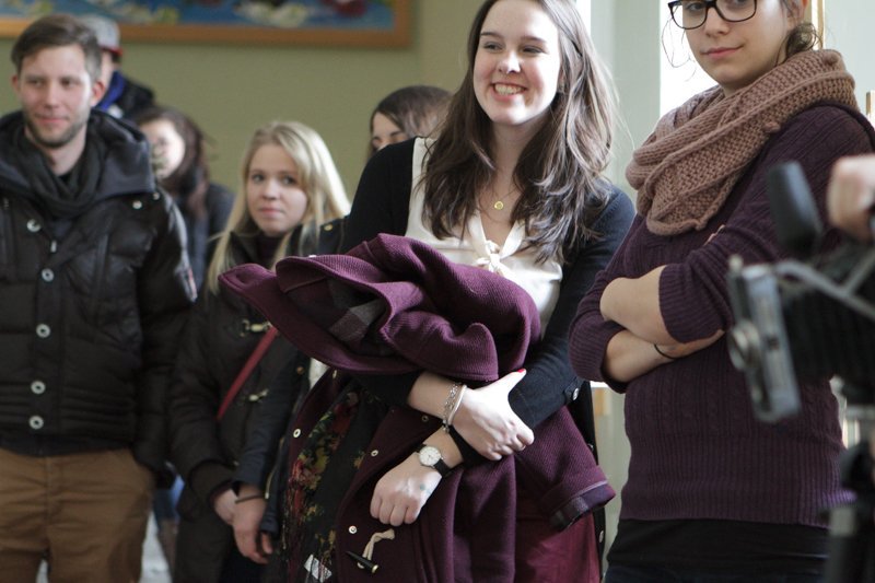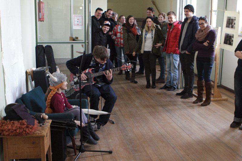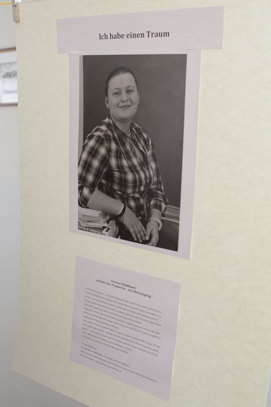 Frau Wenk, Fachlehrerin für Kunst, Fotografin und Wohnheimleiterin hatte sich mit ihren Schülern ein besonderes Projekt ausgedacht. Man kennt vielleicht von der Zeitschrift „Die Zeit“ die Rubrik „Ich habe einen Traum“, in der berühmte Persönlichkeiten wie z.B. Steven Spielberg, Denzel Washington oder Karl Dall mit einem Schwarzweißfoto schon abgebildet wurden. Darunter steht in einem kurzen Text geschrieben, was die Persönlichkeiten in ihrem bisherigen Leben erreicht haben und von was sie träumen. Im Kunstunterricht von Maria Wenk fotografierten sich die Schüler gegenseitig mit einer analogen Kamera und monochromem Film und schrieben schließlich noch ihre eigenen Träume dazu. Die so entstandenen Werke wurden bei der heutigen Vernissage vorgestellt. Als kleinen Gimmick stellten die Schüler Requisiten und einen Sessel mit Hintergrund bereit, vor dem sich jeder, der wollte, für eine kleine Gegenleistung von 1,50 € von einer Polaroidkamera mit Farbfilm fotografieren lassen. Der Erlös wird zur Refinanzierung der Polaroidfilme genutzt, da diese recht teuer sind.