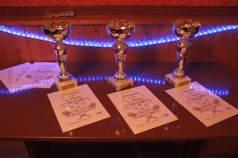 Sportlicher Ehrgeiz gepaart mit guter Stimmung und freundschaftlicher Verbundenheit - das ist es, was ein Dart-Turnier ausmacht; und am Samstag sprang der Funke sofort über! Wer Geschmack gefunden hat und sich von den spannenden Spielen der Weltmeisterschaft kurz vor Weihnachten noch hat inspieren hat lassen, der kann gerne einmal zum DC Troublemakers zum "Schnuppern" kommen. Jeden Dienstag ab 19:00 findet das Vereinstreffen im Stegerbräu statt. Der Verein hat übrigens jeweils eine Damen- und eine Herrenmannschaft für den Ligabetrieb gemeldet. Vorstand Andi Wulff und Andreas Worf sowie "Chef-Organisatorin" Sandra Plaul freuen sich jederzeit auf Interessierte und - wenn's gefällt - neue Mitglieder.