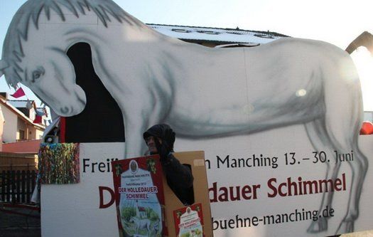 Es ist wieder so weit... Am Faschingssonntag in Manching hat unsere Theaterbühne bereits den Holledauer Schimmel durch die Strassen von Manching reiten lassen. Allerdings noch auf 4 Rädern... und mit einem Zugfahrzeug. Die ersten Flyer wurden auch schon verteilt, die Mitwirkenden halten ihre Textbücher in den Händen, die Rollen sind vergeben, der Probenplan steht. Startschuss für das 3. Freilichttheater "Der Holledauer Schimmel" von Alois Johannes Lippl. 5 Jahre nach Gump und Gänswürger - Die Räuber vom Donaumoos im Jahre 2008, beginnen die Vorbereitungen für unser Highlight. Pünktlich zum 40. jährigen Bestehen der Theaterbühne Manching e. V. spielen wir "ein Schelmenstück aus dem Hopfenlande", wie der Autor selbst über das Stück sagt. Die beiden Holledauer Ortschaften Haselbach und Banzing sind seit Jahren verfeindet.