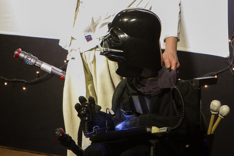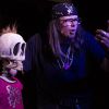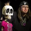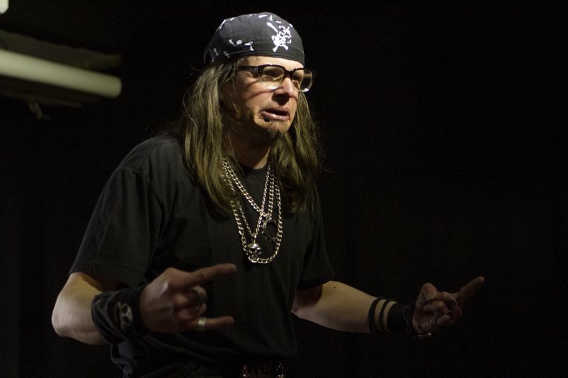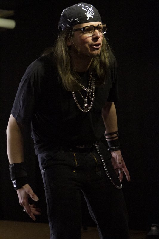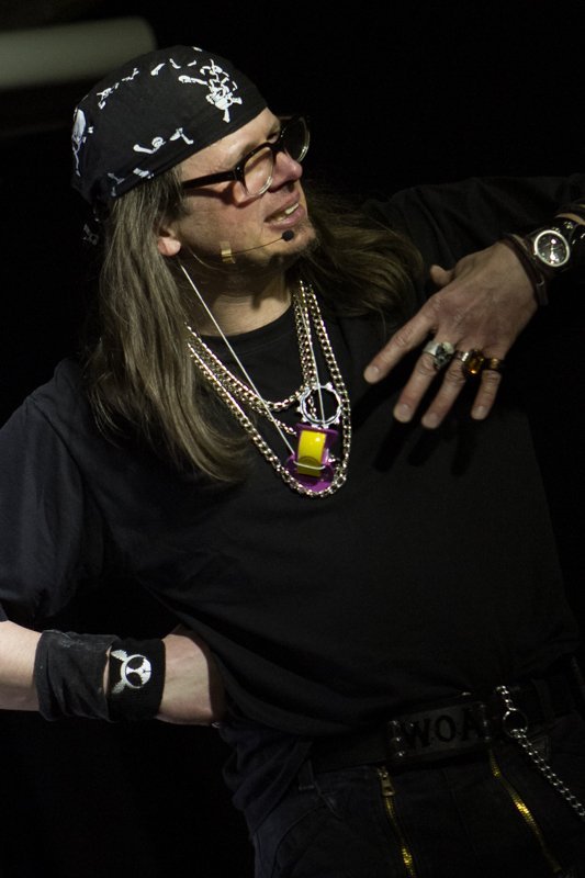 In seiner Karriere arbeitete Heinrich bereits mit bekannten Größen zusammen. So spielte er mit Hansi Hinterfinger (nicht Hinterseer!) alias Florian Simbeck ein Liedchen, lud Arthur Senkrecht vom Duo Senkrecht & Pusch (Hallertau.info berichtete) ein und diskutierte mit Edmund Stoiber alias Wolfgang Krebs das Zugproblem – angelehnt an Stoibers bekannte Transrapid-Rede. Doch jetzt wird erstmal gerockt. Die „düstere Stimme aus der Finsternis, der Meister des Schwermetalls“ betritt die Bühne: Karl Seitenbacher, der schwäbische Rocker, ist ganz stolz darauf, dass seine Band „Burning Assholes“ jetzt dann auf Wacken spielen dürfen. Sogar als Vorband von „Zombiefozzi“. Im Songschreiben ist er immer ungestört, denn die besten Songs wie „Maultäschle of Hell“ textet er beim großen Geschäft. Kaum will er seine Gitarre aus dem Koffer ziehen, baumelt ihm alsgleich ein „rosa Knöcherle“ am Arm herum. Es stellt sich heraus, dass das Ein-Meter-Skelettmännchen mit der „Klein Kevin“ Boxershort und dem glitzernden Schriftzug „Bye-Bye“ auf seinem Shirt der Maik ist. „Warte mal,“ kommentiert der Karl, „du bist der Tod? Ja macht den Job jetzt auch der Ossi?“. Aha, also wird der Tod den Seitenbacher jetzt wohl holen: „Seitenbacher Karl, heute, Pfaffenhofen, Herzattacke“ liest klein Maik vor. Der Metaller sorgt sich allerdings weniger um sein Leben als um seine Riesterrente und den gebuchten Urlaub. Im Gespräch stoßen die zwei schwarzen Seelen schließlich auf die gemeinsame Leidenschaft: sie sammeln beide Figuren der Überraschungseier. Der Knaller kommt jetzt. Maik sucht schon ewig nach der Gelegenheit, den heißbegehrten Eierlauf-Schlumpf zu ergattern und Karl hat ihn! So machen die beiden einen Deal: „Abholtermin verschoben“, Eierlauf-Schlumpf gegen das Leben vom Seitenbacher Karl.