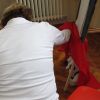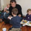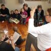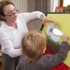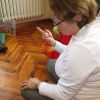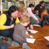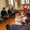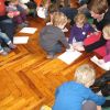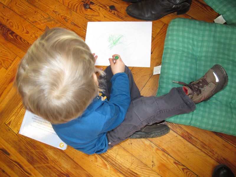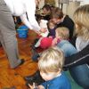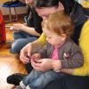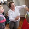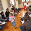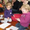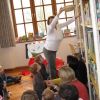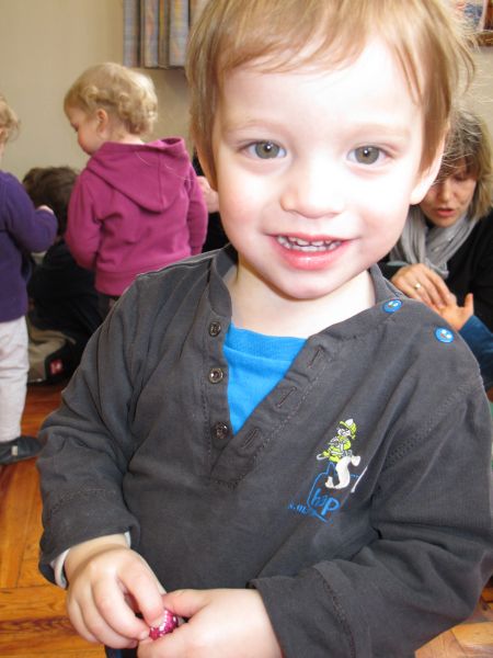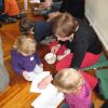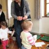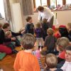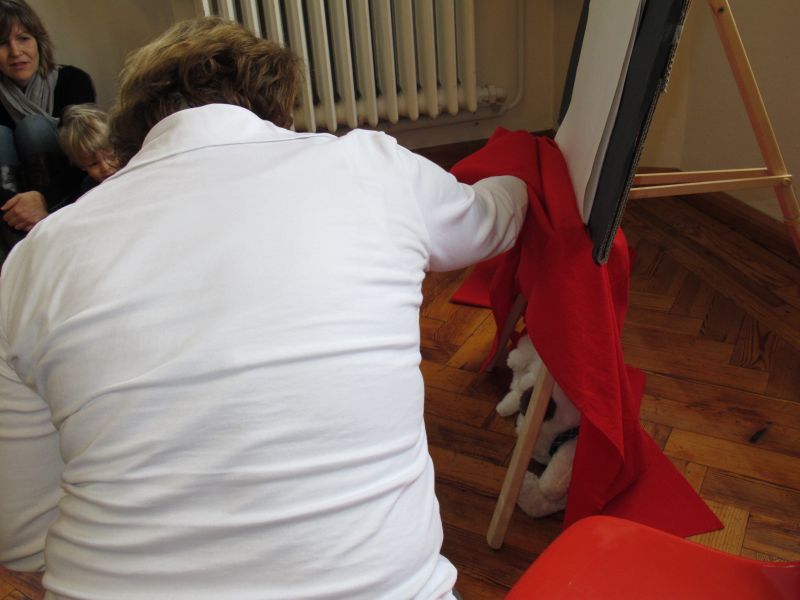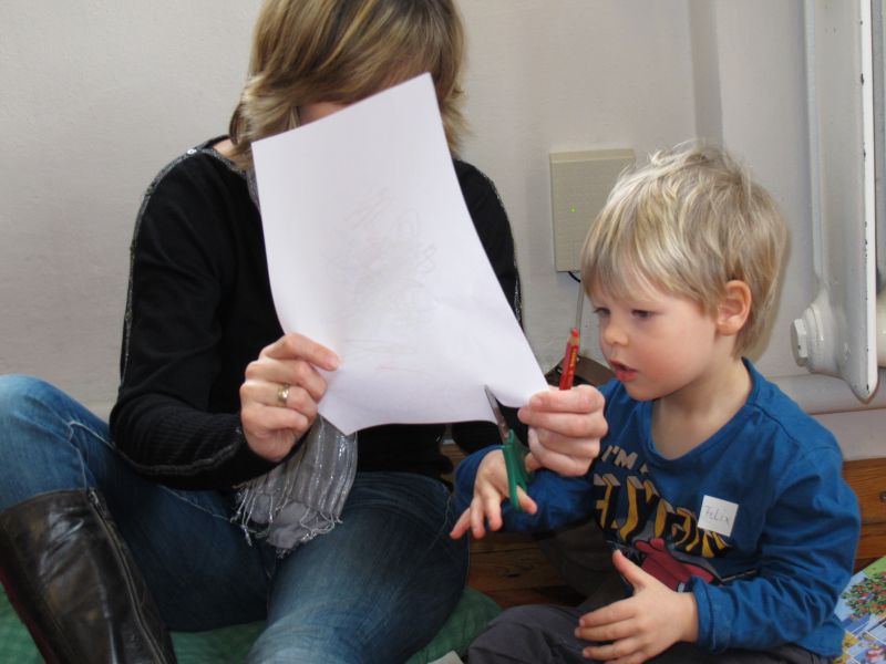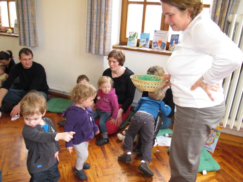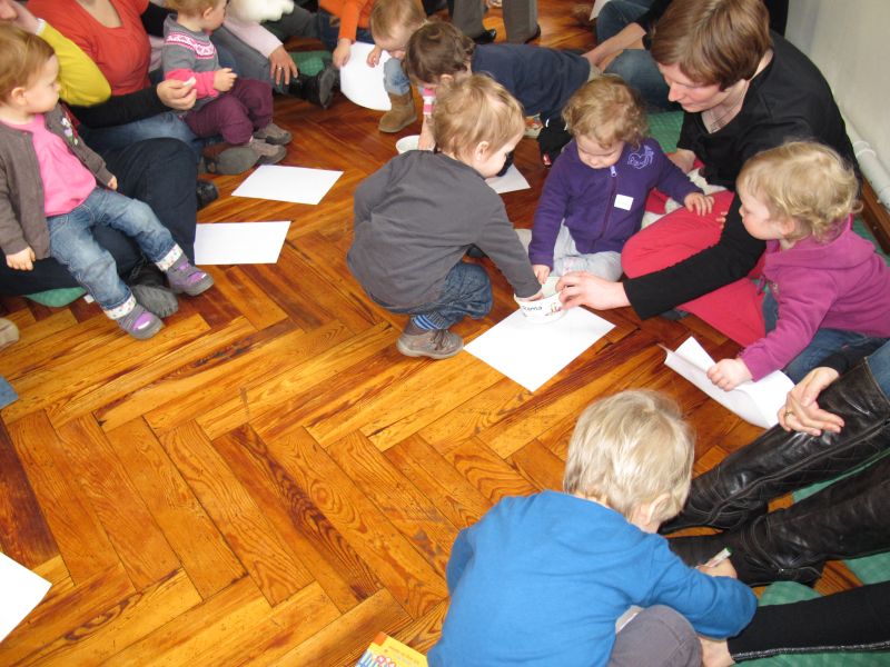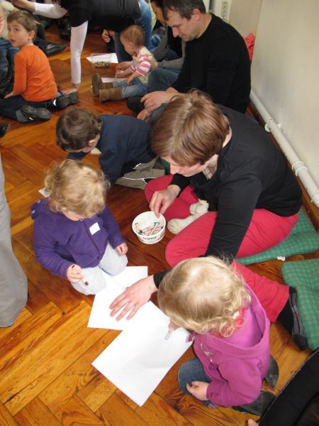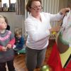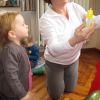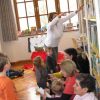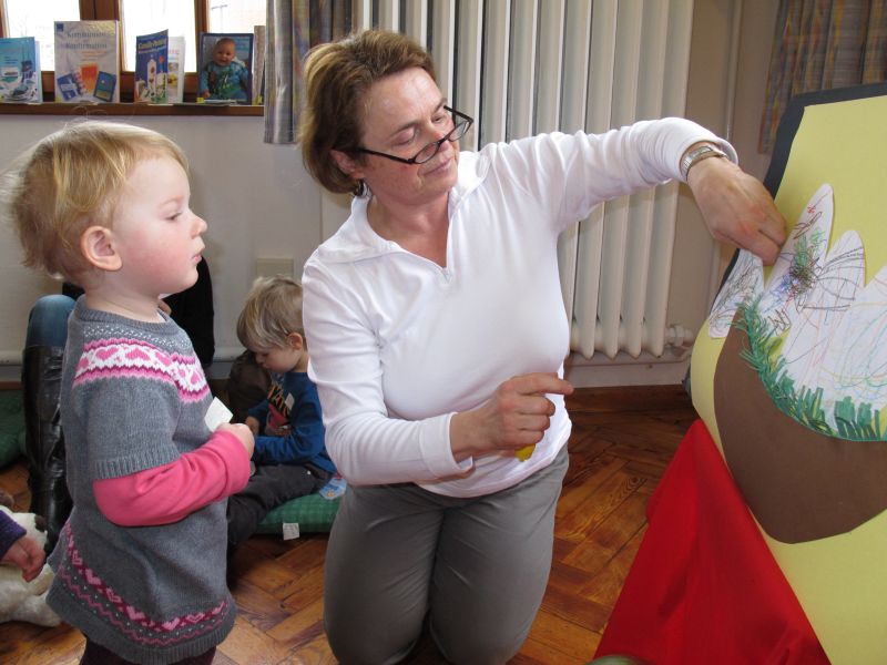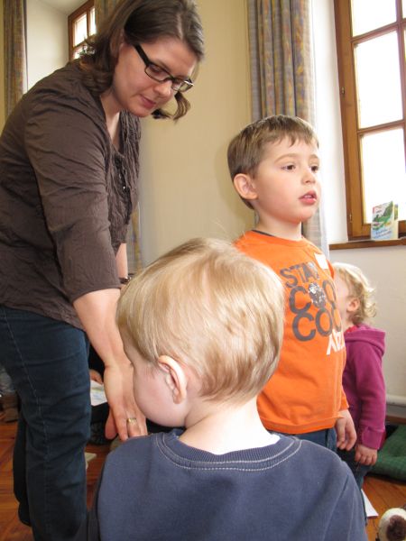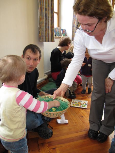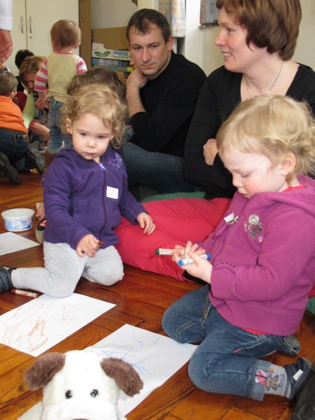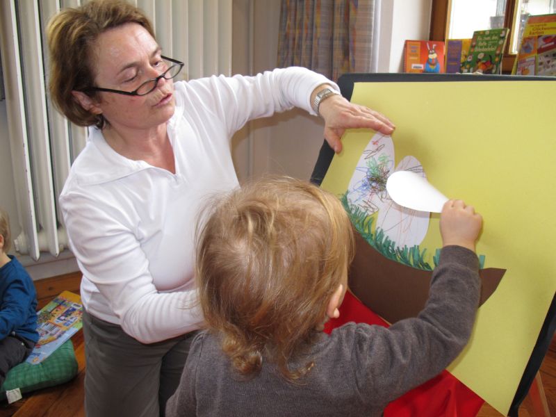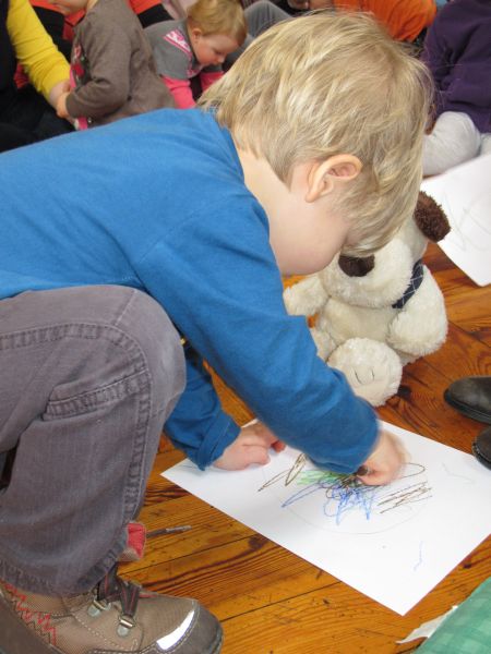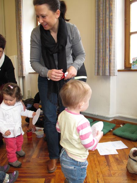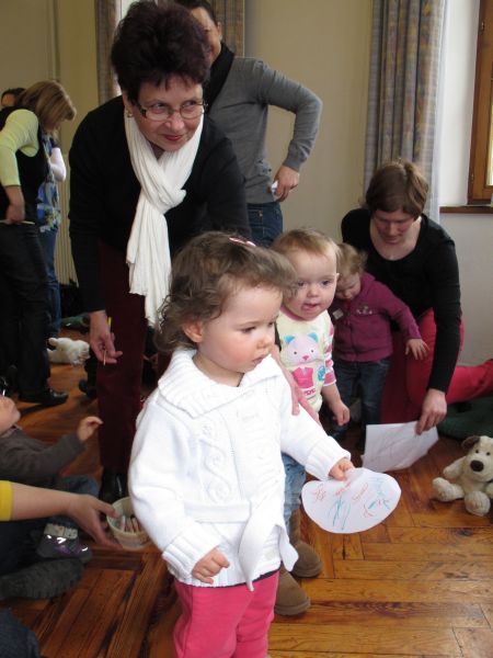 Frau Fuchs las ihnen dann eine kurze Ostergeschichte vor, bei der es um ein genauso riesiges Osterei ging, es wurden auch noch einige lustige Abzählreime gesungen, und dann durften sich die kleinen Mädchen und Buben künstlerisch betätigen.