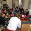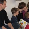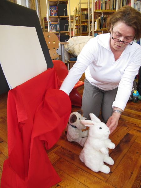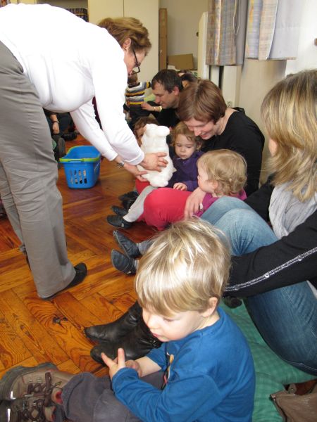 Am Anfang wurde der beliebte Stoffhund Wuff mit einem Lied aus seinem Versteck gelockt. Wuff darf bei jeder Vorlesestunde dabei sein, aber diesmal hatte er sogar noch einen Freund dabei. Ein schneeweißer Hase saß mit ihm in der Hundehütte, der genauso wie Wuff freudestrahlend von den 15 Kleinkindern begrüßt wurde.