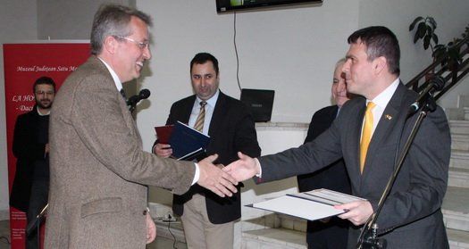 Adrian Ştef, Präsident des Rates des Bezirks Satu Mare/Sathmar (rechts), verleiht dem Manchinger Museumsleiter Dr. Wolfgang David M.A. (links) ein Ehrendiplom.