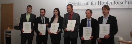 Von Pflanzenschutz über Produktionstechnik bis hin zur Züchtung neuer Sorten, Dr. Peter Doleschel gab einen kurzen Einblick, in welchen Bereichen in Hüll geforscht wird. „Neben der Zucht ist natürlich eine unserer Hauptaufgaben die Entwicklung neuer Pflanzenschutzmittel“, so Doleschel. Aber auch im Bereich der Niedriggerüstanlagen wird draußen in Hüll fleißig geforscht. Besonders stolz zeigte man sich Seitens der Gesellschaft für Hopfenforschung allerdings auf den jungen wissenschaftlichen Nachwuchs. Gleich sechs junge Forscher wurden für ihre Arbeiten im Zusammenhang mit Hopfenbau und Braukunst mit Geldpreisen der Dr. Nienaber Stiftung ausgezeichnet. „Die Forschungen sind für uns von unschätzbarem Wert“, so Möller, der den jungen Wissenschaftlern für ihre herausragende Arbeit gratulierte.