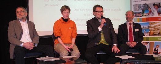 Landrat Martin Wolf lud am Samstag auf die Pfaffenhofener Messe „Gut-leben, Gutwohnen“ ins Zelt „Rund um die Region“, um die Wirtschaftsförderung des Handwerks durch den Landkreis zu zeigen. Wolf übernahm selbst gekonnt und bestens vorbereitet die Moderation. Auf dem Podium: der Obermeister der Schreinerinnung Pfaffenhofen-Ingolstadt Josef Pfab, seine Azubi im 3. Lehrjahr Vera Riesenbeck und der Berufsschullehrer Karl-Martin Sedlmeier, Leiter der Abteilung Holz in Pfaffenhofen.