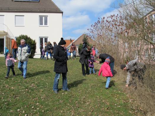 Hier war ein sehr fleißiger Osterhase am Werk. Fast eine halbe Stunde sausten die Kleinen durch den großen Garten und jedes hatte am Schluss eine riesen Ausbeute. Zur Stärkung gab’s noch Saft und Kuchen, und für die Erwachsenen, die so geduldig in der Kälte warteten, wurde heißer Kaffee ausgeschenkt.