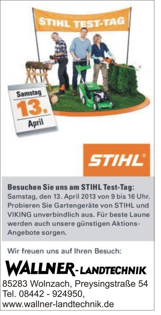 Hobbygärtner und Heimwerker am Samstag, 13. April, bei der Auswahl neuer Motorgeräte folgen. Die Fa. Wallner Landtechnik KG lädt im Rahmen des STIHL Test-Tags 2013 alle Interessierten von 9.00 Uhr bis 16.00 Uhr ein, eigene Erfahrungen mit Motorsäge, Motorsense, Heckenschere, Rasenmäher oder Gartenhäcksler zu sammeln.