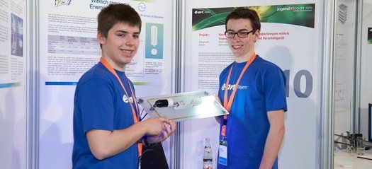 Die Gewinner des Landeswettbewerbs „Jugend forscht“ Bayern stehen fest. In der Straubinger Joseph-von-Fraunhofer-Halle wurden die Landessieger in den Fachgebieten Arbeitswelt, Biologie, Chemie, Geo- und Raumwissenschaften, Mathematik/ Informatik, Physik und Technik im Beisein von Staatssekretär Bernd Sibler, Bayer. Staatsministerium für Unterricht und Kultus, und Thomas Barth, Vorstandsvorsitzender des Patenunternehmens E.ON Bayern, ausgezeichnet. Den Sonderpreis Elektronik, Energie- und Informationstechnik erhielten Martin Großhauer und Marian Schneider vom Gymnasium Wolnzach für ihre Forschungsarbeit im Fachgebiet Technik.