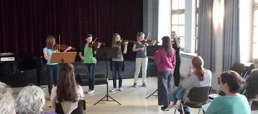 Vorspiel der Musikschulklasse im Haus der Begegnung Pfaffenhofen, es spielten Mädchen aus der Klasse von Eva Bonk (Violine). Sieben junge Geigerinnen gaben ihr Bestes vor Eltern, Großeltern und einer stehst gut gelaunten Musikschul-Lehrerin. War der Anfang noch etwas verzögert so verflog die Nervosität schnell, nachdem die ersten Töne durch den Raum hallten.