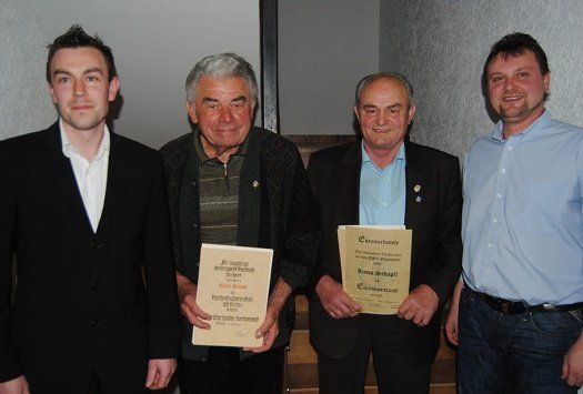 Zum Ende der Veranstaltung wurden noch bronzene, silberne und goldene Vereinsnadeln an einige Mitglieder überreicht. Eine ganz besondere Auszeichnung für ihre langjährige Mitgliedschaft ging an Erich Heindl und Hans Schapfl. Ihnen überreichte der 2. Kreisvorsitzende des BLSV Stefan Garbatsch die goldene Verdienstnadel mit Kranz samt einer Urkunde.