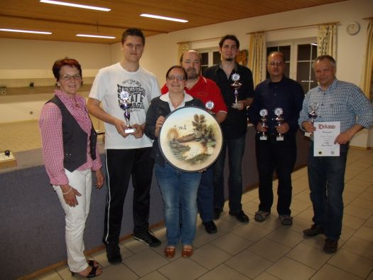Sigrid Kersten mit den Vereinsmeistern Thomas Paril, Sonja Weniger, Walter Rebmann, Manuel Kellermann, Gerhard Herrmann, Bernd Brosius