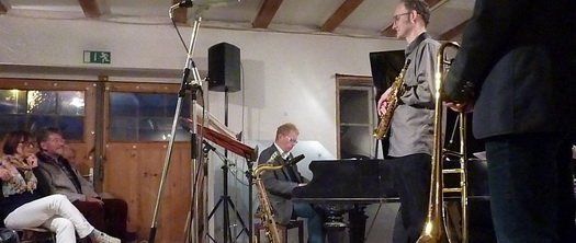 Kaum verlässt das Ensemble einmal seine hombase, schon fällt der Mann am Klavier aus, der eingesprungene Michael Flügel an demselben erledigte jedoch die ihm gestellte Aufgabe mit Bravour. Des weiteren, am Bass Rudi Engel, mit gnadenlos flinken Fingern an den Saiten, Johannes Herrlich, der Bahnfahrer, weil er Zugposaune spielt, ohne Fehler und besagter Preisträger Christoph Hörmann an den Saxophonen.