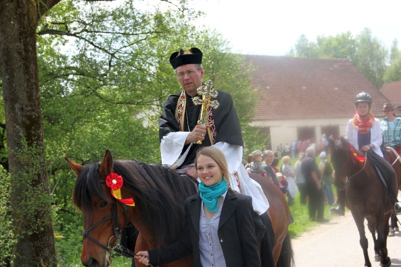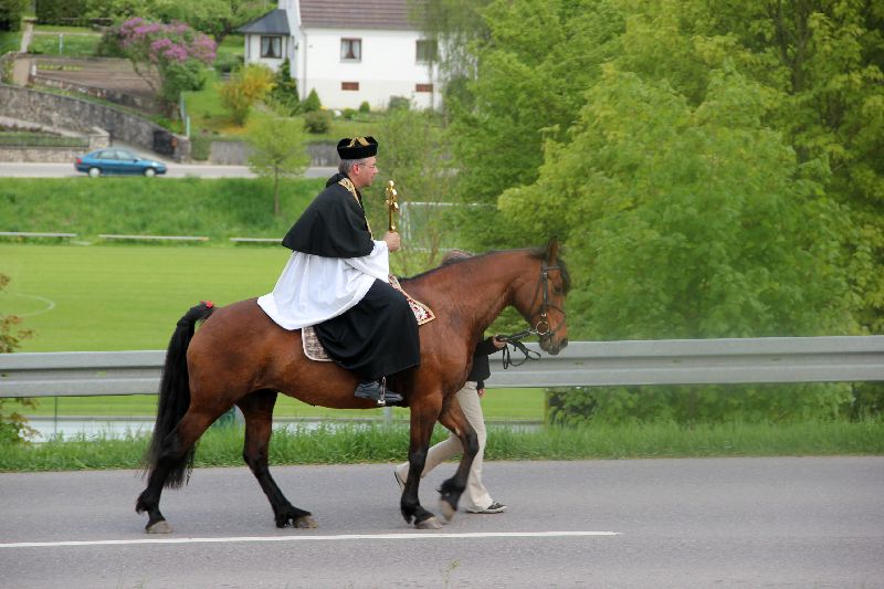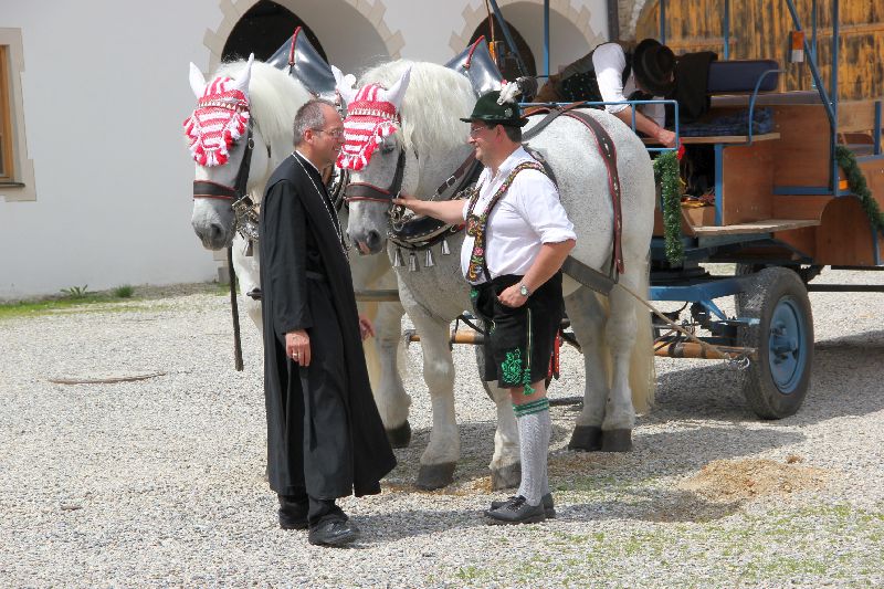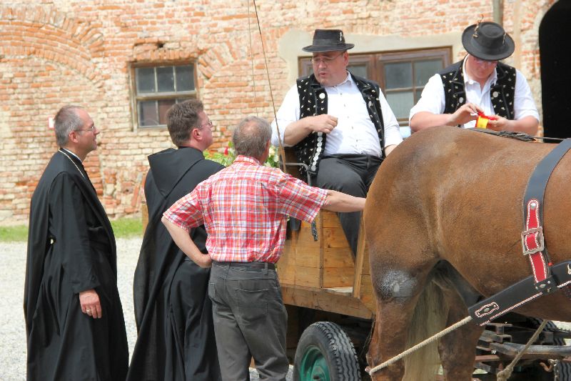 Seit 2003 ist die Tradition des Scheyrer Kreuzritts wiederbelebt und feiert demzufolge in diesem Jahr ihren 10. Jahrestag. Das Wetter spielte mit am Himmelfahrtstag und so versammelten sich die Pferde und ihre Reiter im Gelände des Prielhofs. Geschmückt und hergerichtet, angeführt vom Scheyrer Kreuz machte sich die Karawane auf den Weg. Abt Markus Eller nahm wie eigentlich jedes Jahr ebenfalls hoch zu Ross an der Prozession teil.