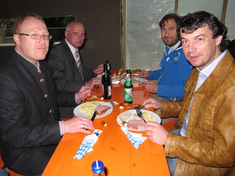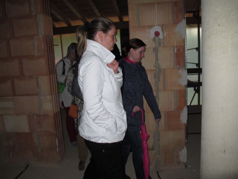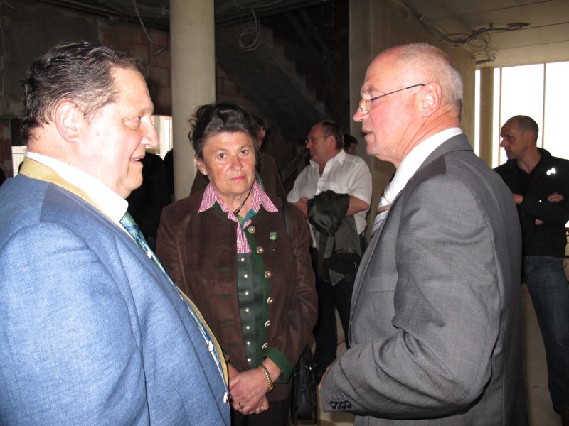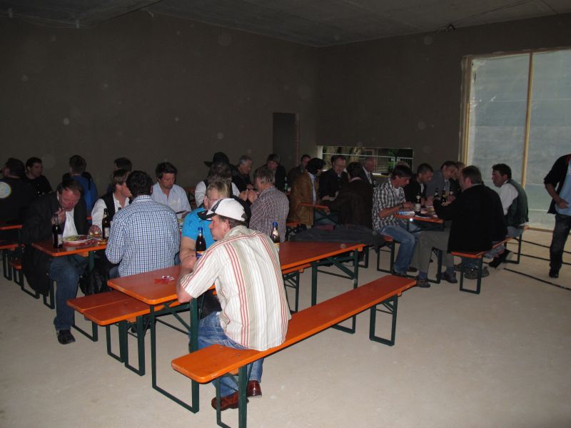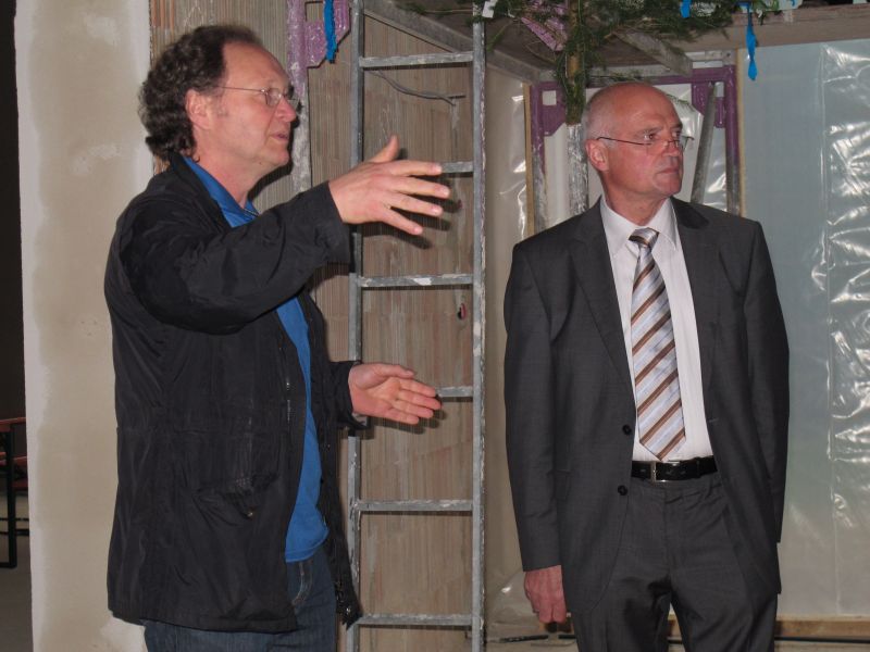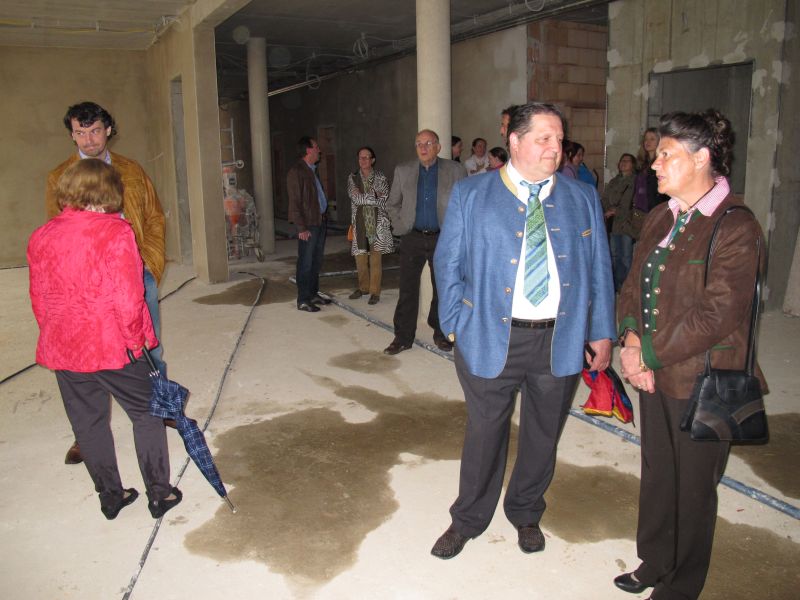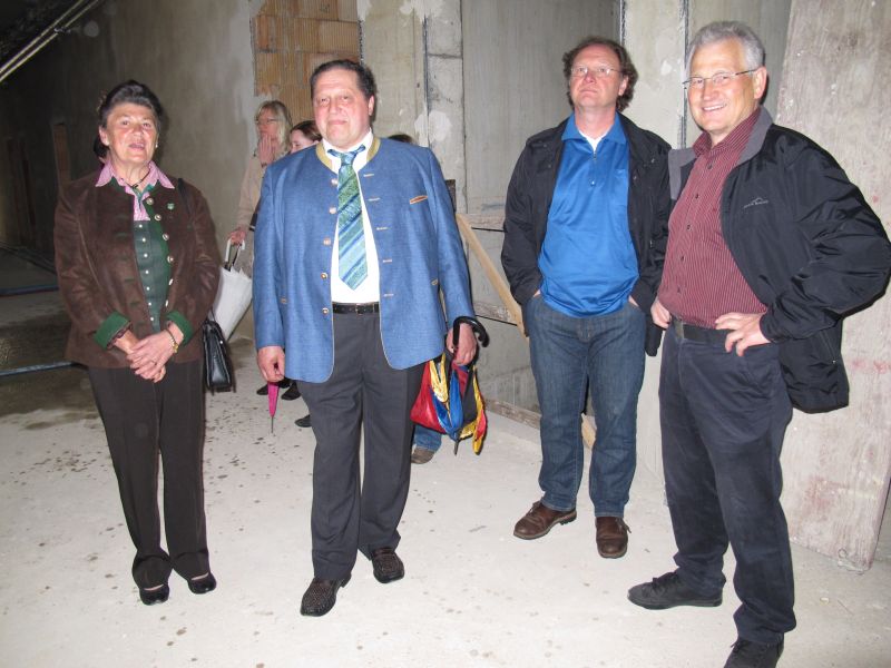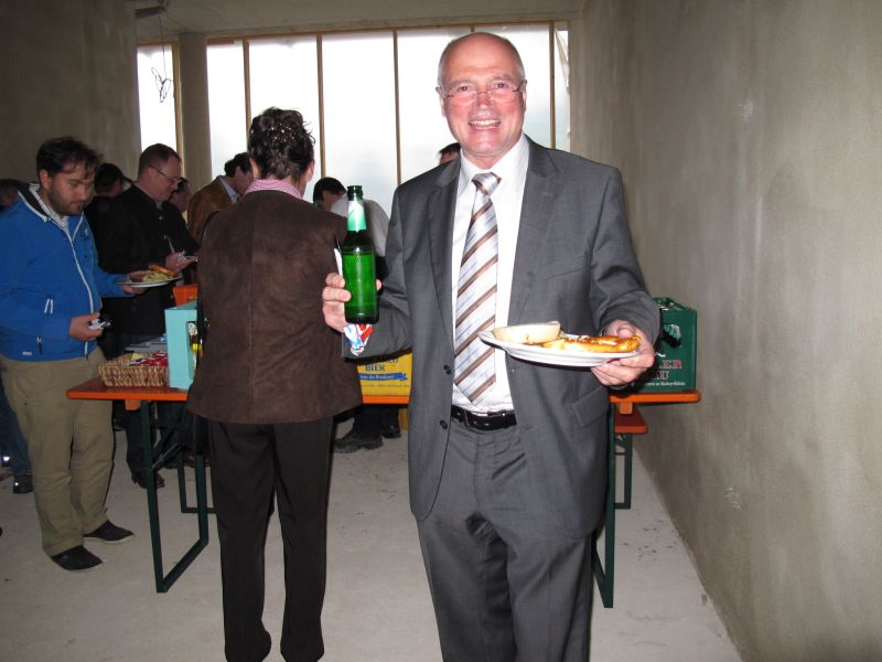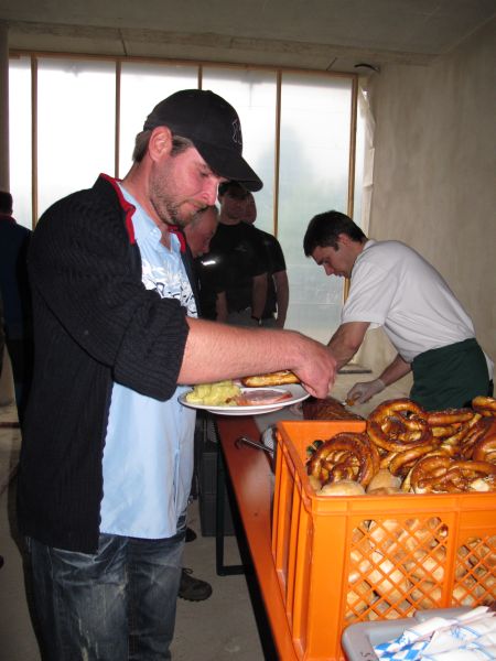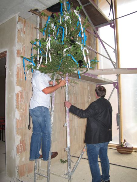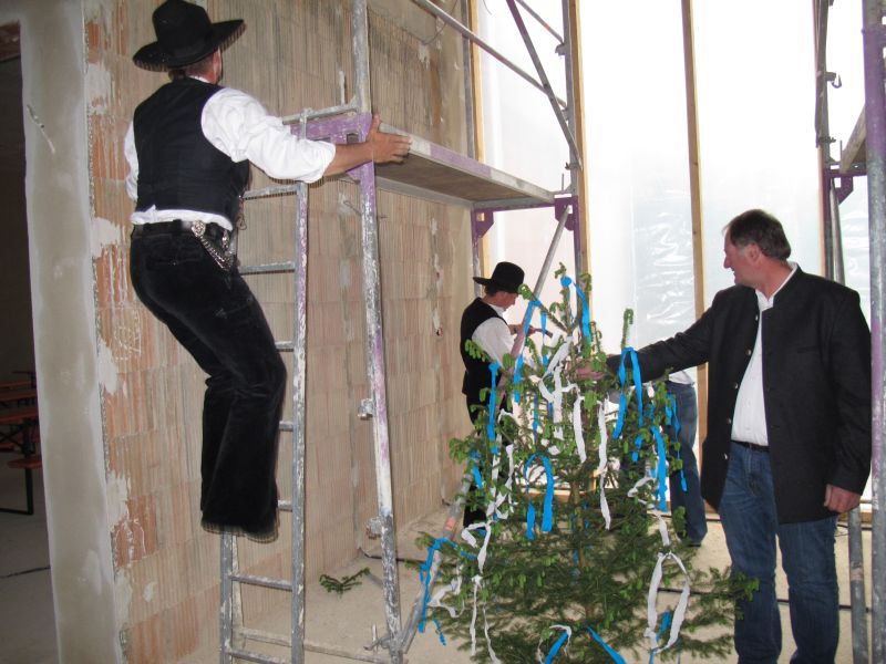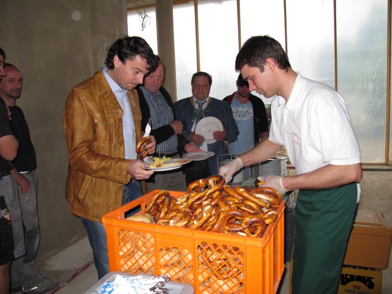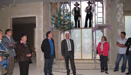 Nach dem Anbringen des geschmückten Baumes am Innengerüst, da es draußen wie aus Eimern schüttete, gab es zur Feier des Tages warmen Leberkäs mit Kartoffelsalat, Brezen und Semmeln, sowie allerlei Getränke. Danach konnten die Räumlichkeiten besichtigt werden. Vor allem die Kindergärtnerinnen schauten sich ihren neuen Arbeitsplatz sehr genau an und schienen sehr erfreut darüber zu sein was sie sahen.