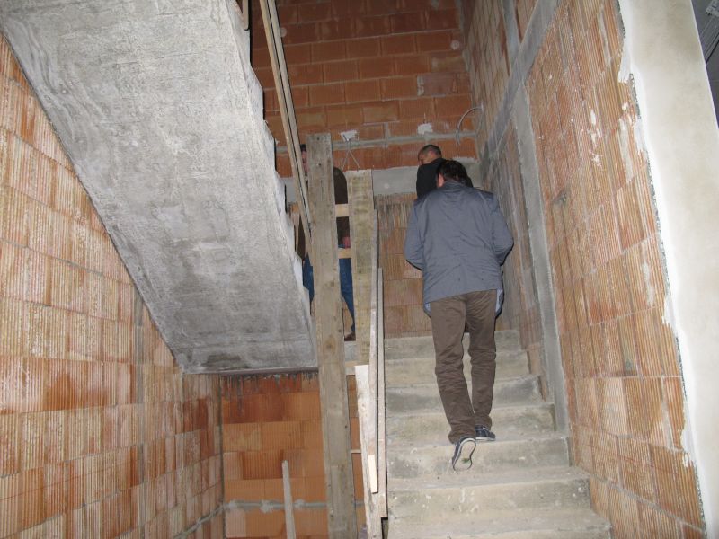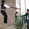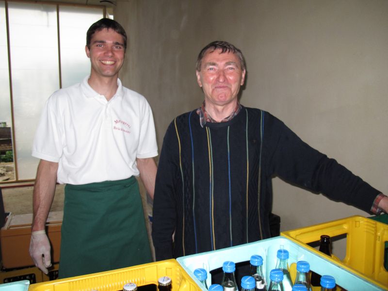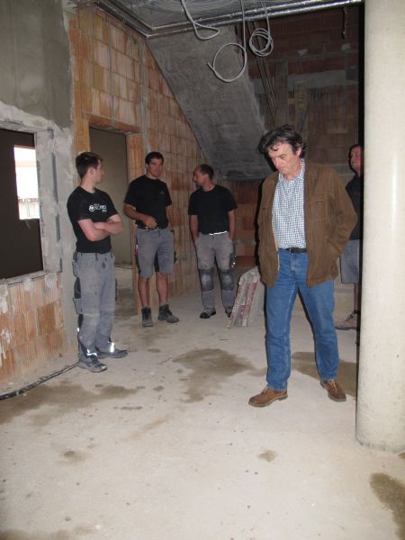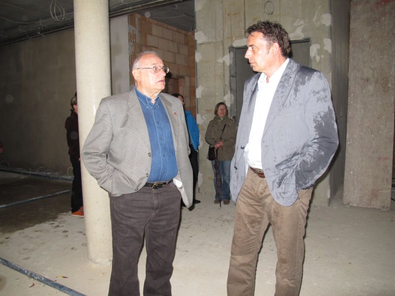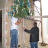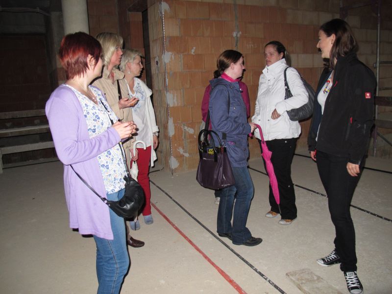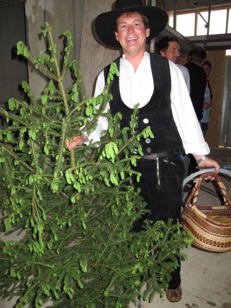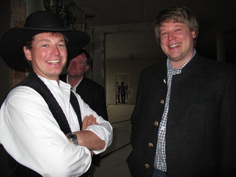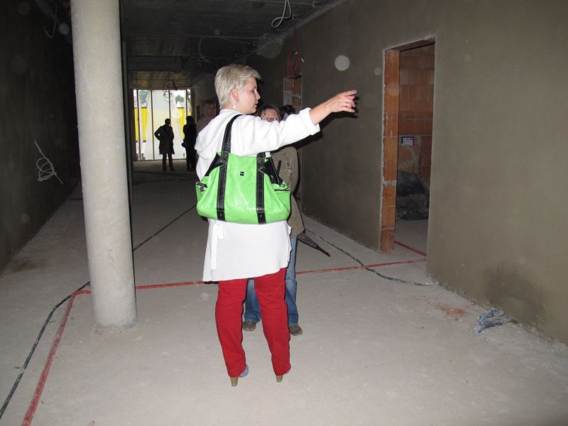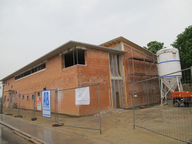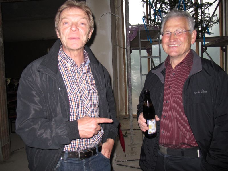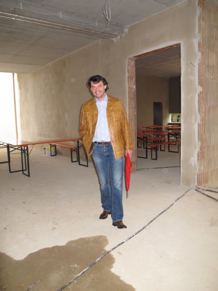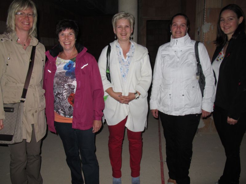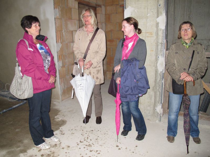 Nach dem Anbringen des geschmückten Baumes am Innengerüst, da es draußen wie aus Eimern schüttete, gab es zur Feier des Tages warmen Leberkäs mit Kartoffelsalat, Brezen und Semmeln, sowie allerlei Getränke. Danach konnten die Räumlichkeiten besichtigt werden. Vor allem die Kindergärtnerinnen schauten sich ihren neuen Arbeitsplatz sehr genau an und schienen sehr erfreut darüber zu sein was sie sahen.