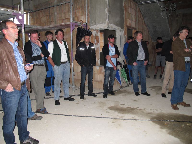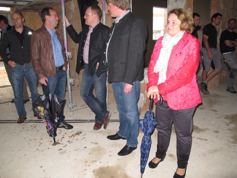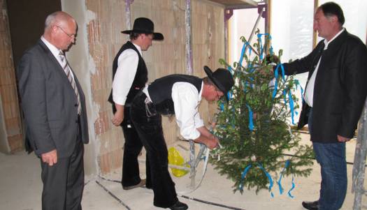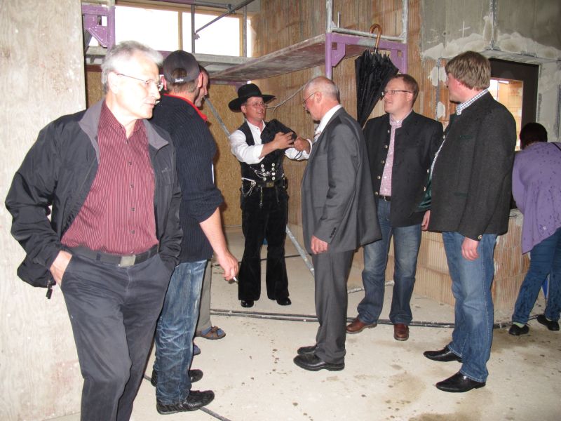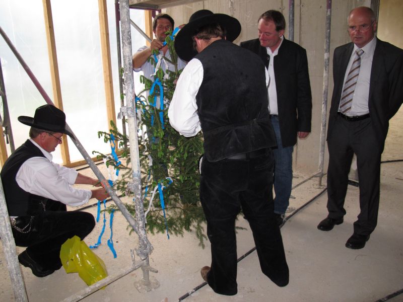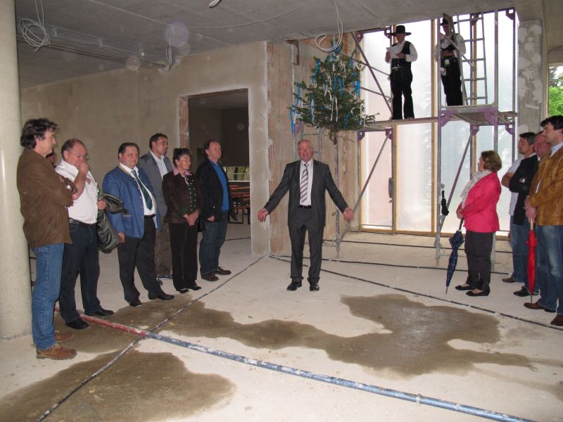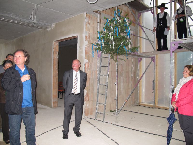 Zur etwas verspäteten Hebefeier des Kindergartens „Am Gabis“ kamen an die 50 geladene Gäste, unter anderem die Architekten Gebr. Bortenschlager, die Leiterin des Neubaus Vicky Wundsch und einige Kindergärtnerinnen, der 3. Bürgermeister Edgar Fellner, einige Stadträte, Martin Huber der für die Statik zuständig war und zahlreiche dort beschäftigte Arbeiter.