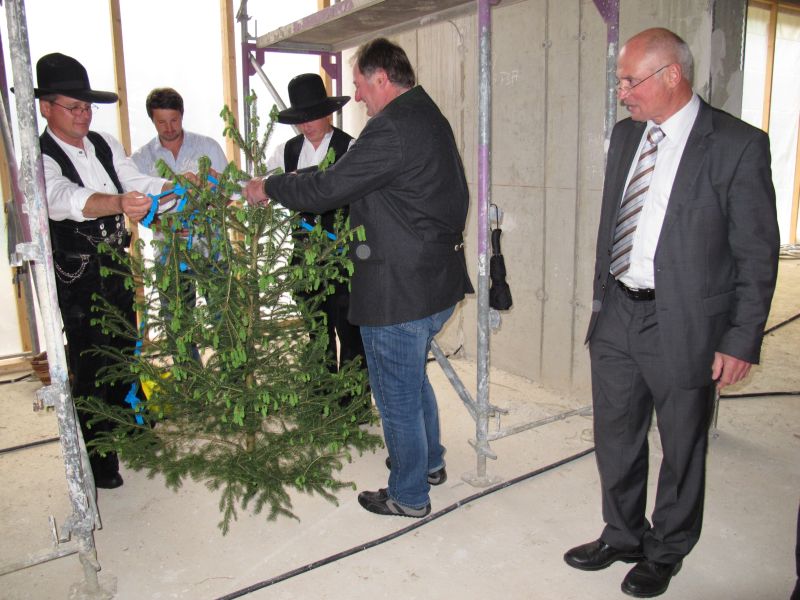 Bürgermeister Josef Reiser begrüßte alle Anwesenden und in seiner kurzen Rede bedankte er sich bei allen am Bau beteiligten für den zügigen Baufortschritt und ist guter Hoffnung, dass pünktlich zum neuen Kindergartenjahr die Räumlichkeiten bezogen werden können.