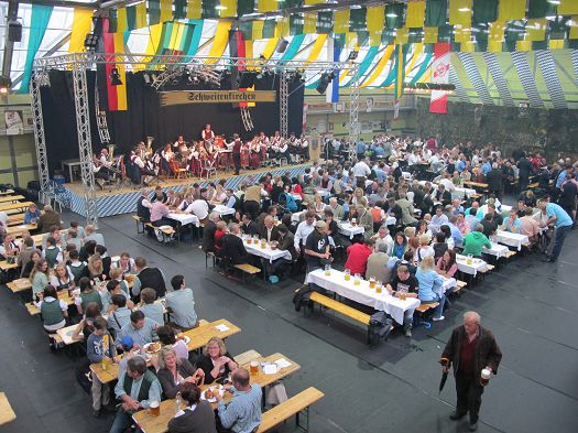Leider verregnete ein gewaltiger Gewitterschauer den Schweitenkirchnern das Standkonzert und den Einmarsch zur Mehrzweckhalle, wo jedes Jahr wieder das Pfingstvolksfest stattfindet. Mit 3 gewaltigen Schlägen zapfte Bürgermeister Albert Vogler das erste Fass an und verkündete:" o`zapft is ! "