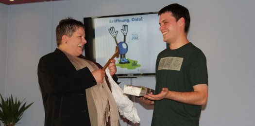 Im Speziellen wurde Stadtjugendpfleger Martin Herker hervorgehoben, der besonders viel Herzblut in die baldige Eröffnung des neuen JUZ gesteckt hatte. Als Dankeschön überreichte ihm Kathrin Maier im Namen der Stadtjugendpflege einen goldenen Hammer, der symbolisieren soll, wie viel Hand der Sozialpädagoge bei der Sanierung selbst angelegt hatte. Dieser aber betonte: „Ohne die Unterstützung verschiedener Bauunternehmen, der vielen freiwilligen Helfer und Künstler hätten wir das nicht geschafft“.