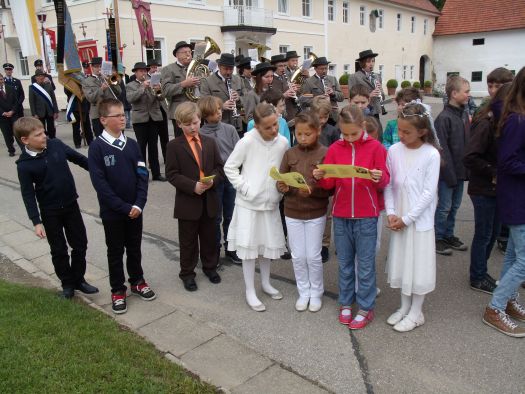 Angeführt vom Kreuzträger folgten die Kirchenfahnen, die Vereinsfahnen, die Ministranten und die Erstkommunionskinder. Ihnen folgten der Pfarrer mit der Monstranz, Bürgermeister Dieter Huber mit Gemeinderäten und Honoratioren sowie die Gläubigen aus allen Ortsteilen. Musikalisch begleitet wurde die Prozession durch die Blaskapelle Rohrbach.