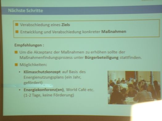 Handlungsempfehlungen für Rohrbach sind abhängig von der Siedlungsstruktur sowie Alter und Lage von Gebäuden. In Ortskernbereichen wie Rohrbach und Fahlenbach sind Sanierungen und Umstellungen auf regenerative Energien leichter als in den Streusiedlungen. So sollten in Ortskernen die Nahwärme- und Gasversorgung ausgebaut werden. In Streusielungen könne man eher auf Holz und Biomasse umstellen und Landwirte und Kleinwaldbesitzer stärker einbinden. Frau Schumm sprach sich aber gegen eine Ausweitung der Biogasproduktion mit Feldfrüchten aus. Hier dürften höchstens 10% der Ackerflächen für Biomasse genutzt werden.